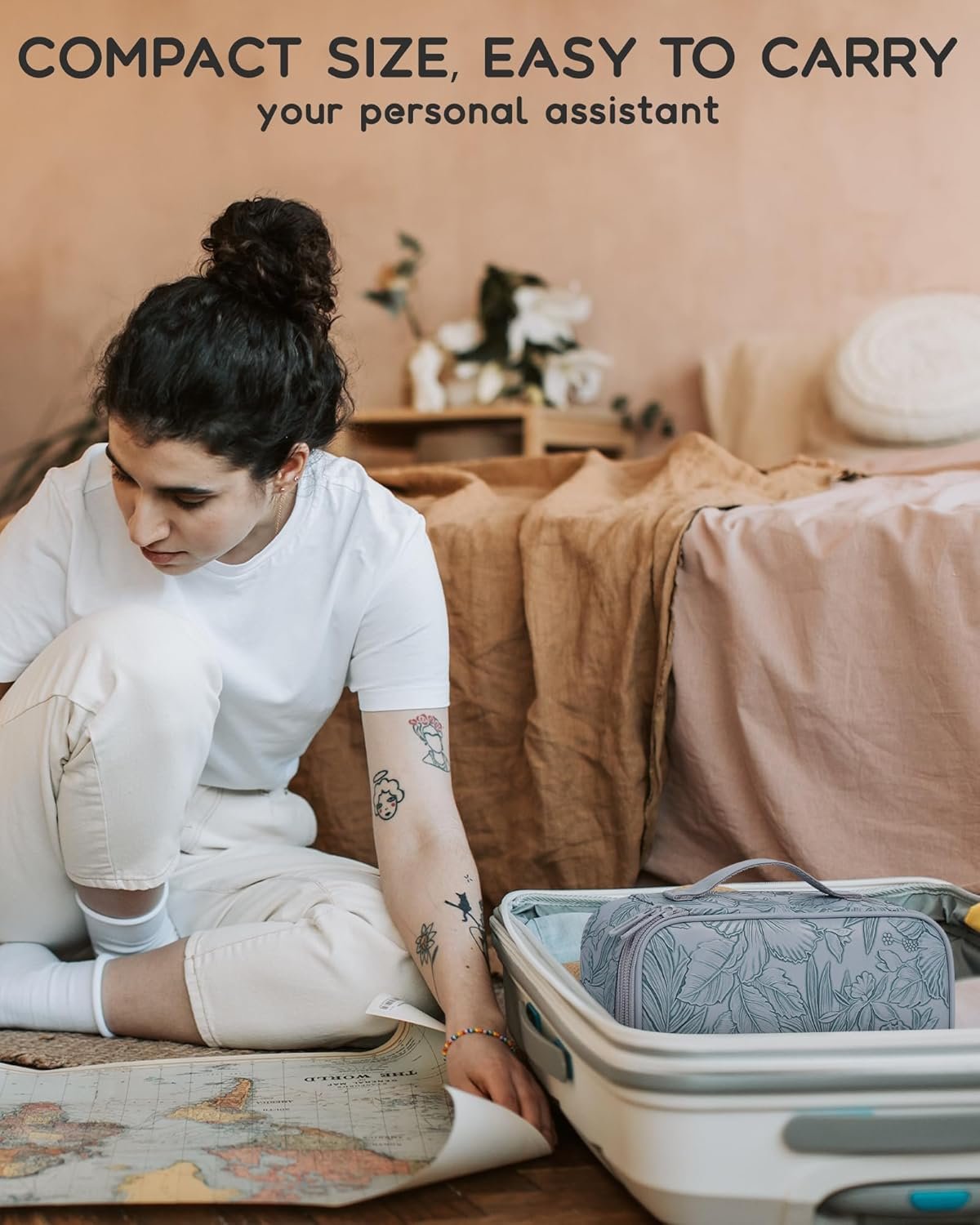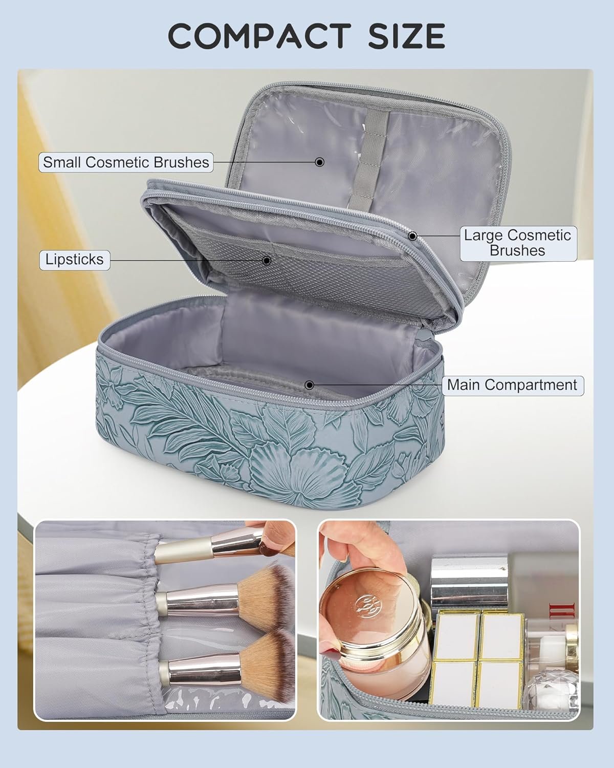 Customers find this makeup bag spacious and well-organized, with a separate compartment for brushes and plenty of room for daily essentials. They appreciate its travel-friendly design, with one customer noting it’s perfect for carrying makeup to work, while another mentions it works well for quick trips. The bag’s appearance receives positive feedback, with one customer comparing it to a mini lunch box, and customers like how everything fits neatly inside.