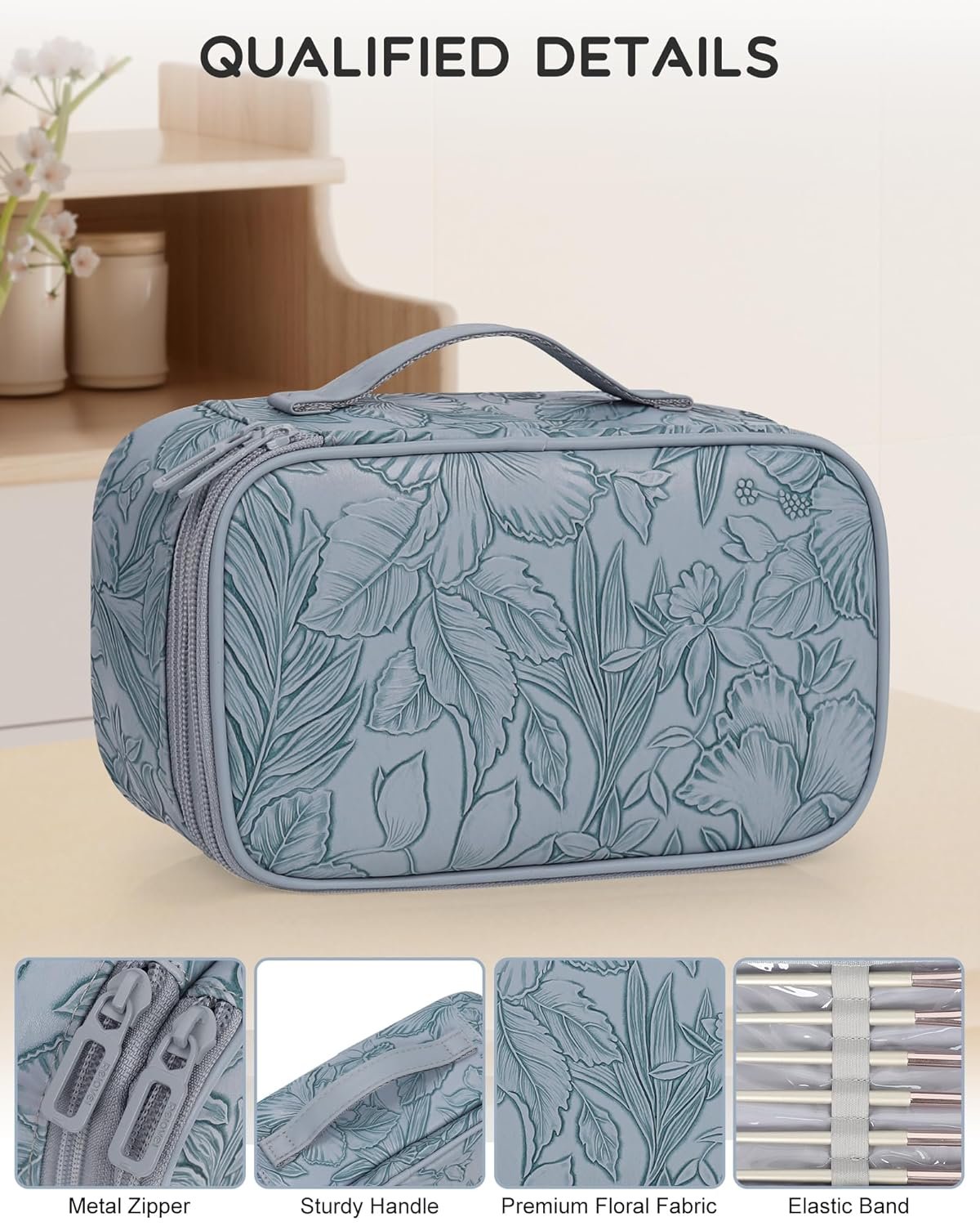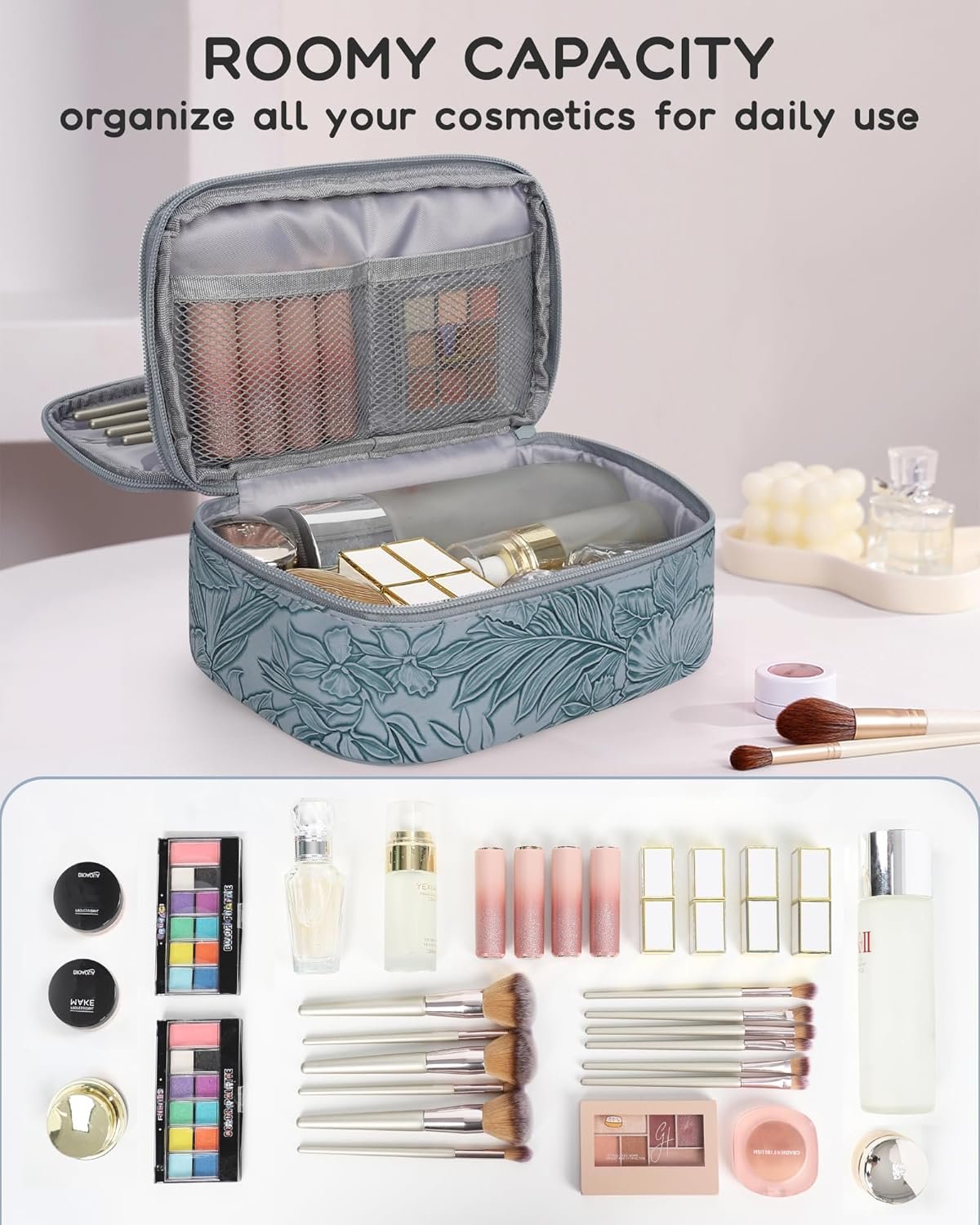 Dual-Layer Versatility – Top Layer with 6 separate elastic bands for lipsticks & eyeliner eyebrow pencil, as well as 4 makeup brushes holder; the bottom layer with 2 mesh pockets for eyeshadow & blush, even 1 big storage space for skincare products or other cosmetics