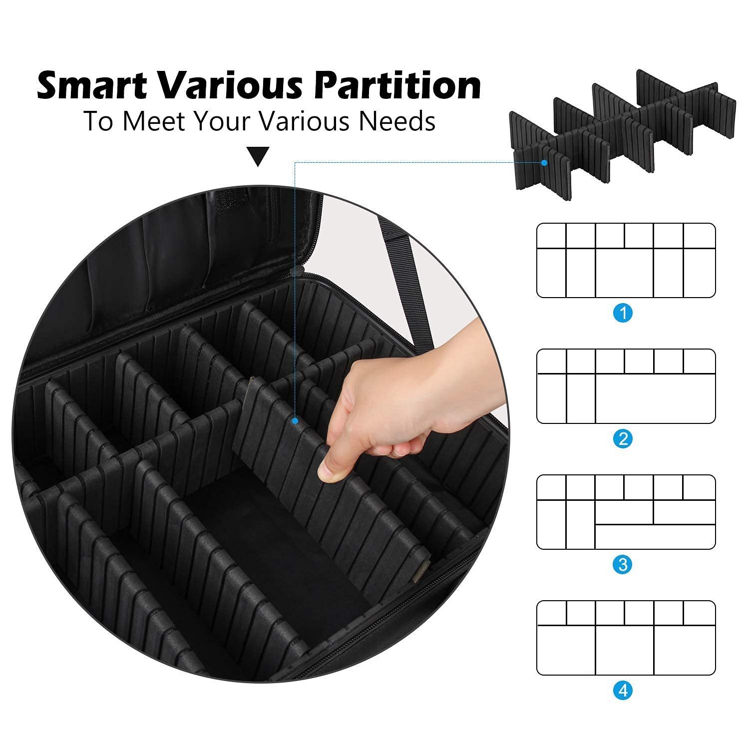 ★DIY SMART DESIGN: Our makeup travel case comes with 9 adjustable EVA dividers, you can move the partitions as needed to fit different cosmetics and keep them perfectly separated and organized.
