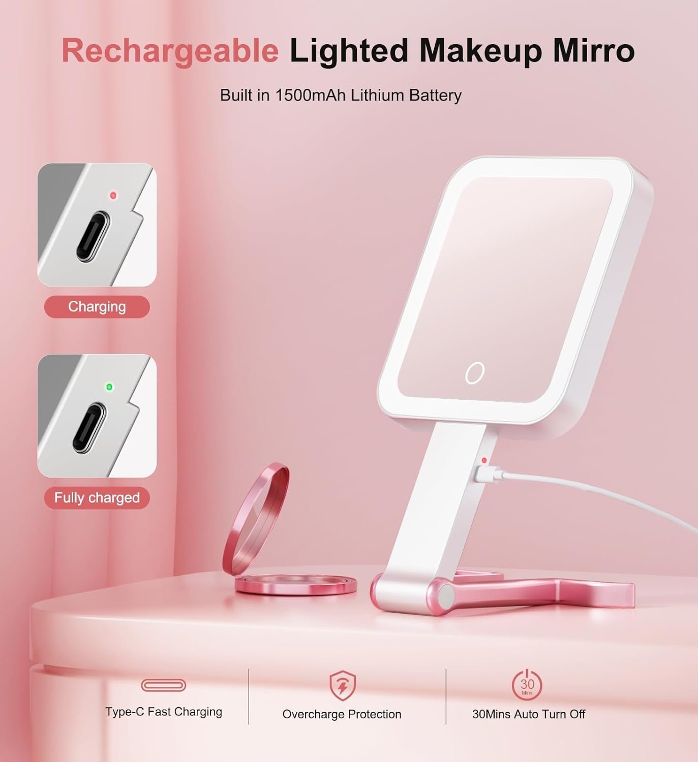 【Rechargeable and Long Battery Life】The rechargeable makeup mirror has a built-in 1500mAh large-capacity battery, which is extremely convenient to charge. Whether it is through a laptop, a mobile power bank, or a Type-C USB charger, it can be easily recharged. The overcharge protection function minimizes the risk of failure and ensures charging safety. At the same time, the battery life of LED mirror is upgraded. After charging for 2 hours, it can continue to work for 4-6 hours. With ultra-long battery life, it can completely eliminate the need for frequent charging.