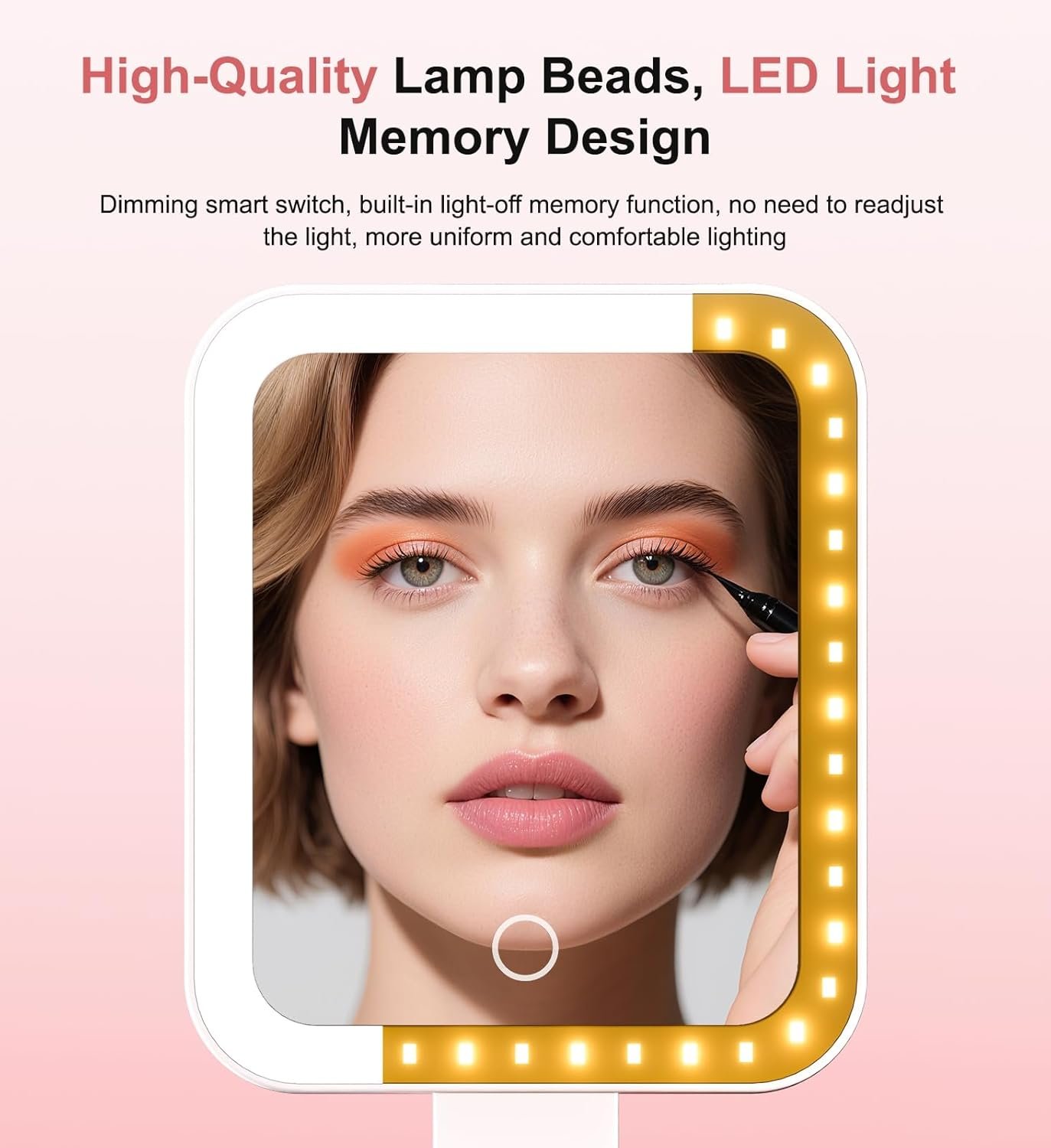 【Various Lighting Experience】 56 LED lights are arranged around the Square compact mirror, with high-quality lamp beads, the light is even and soft, and it can be clearly seen even in dim environments. It supports three color temperature adjustments: cold light, natural light, and warm light. The color temperature is upgraded to 10000k to meet the makeup needs of different scenes. The smart touch mirror button switches the lighting mode, and long press the touch screen to achieve 0-100° stepless adjustment of light brightness.