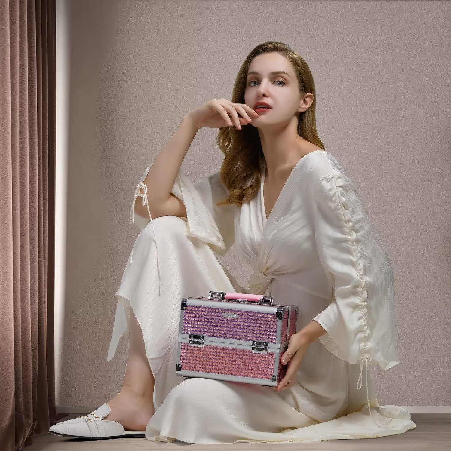 Mermaid Pink Makeup Box: Makeup box measures 9.44 x 6.69 x 7 inches, making it an ideal size for travel. Made from high-quality materials, it combines sturdy ABS aluminum with metal-reinforced corners for excellent durability. Despite its strong construction, the box is lightweight and easy to carry. Its waterproof, glittery pink surface not only looks stylish and eye-catching but also protects your makeup from moisture and other outdoor elements. The unique color subtly changes and reflects light from different angles, adding both beauty and practicality.