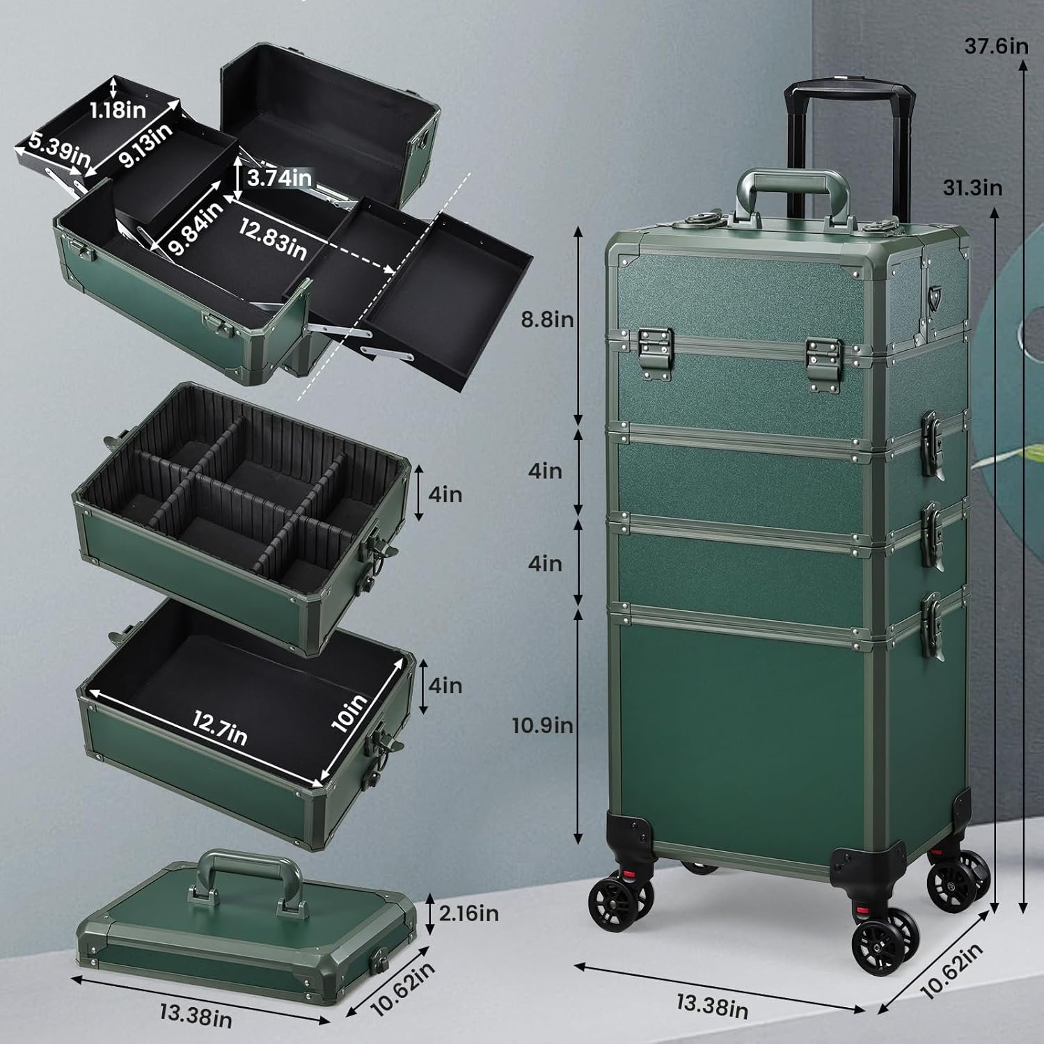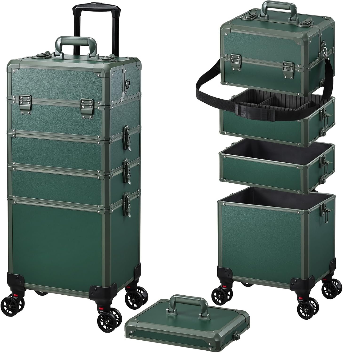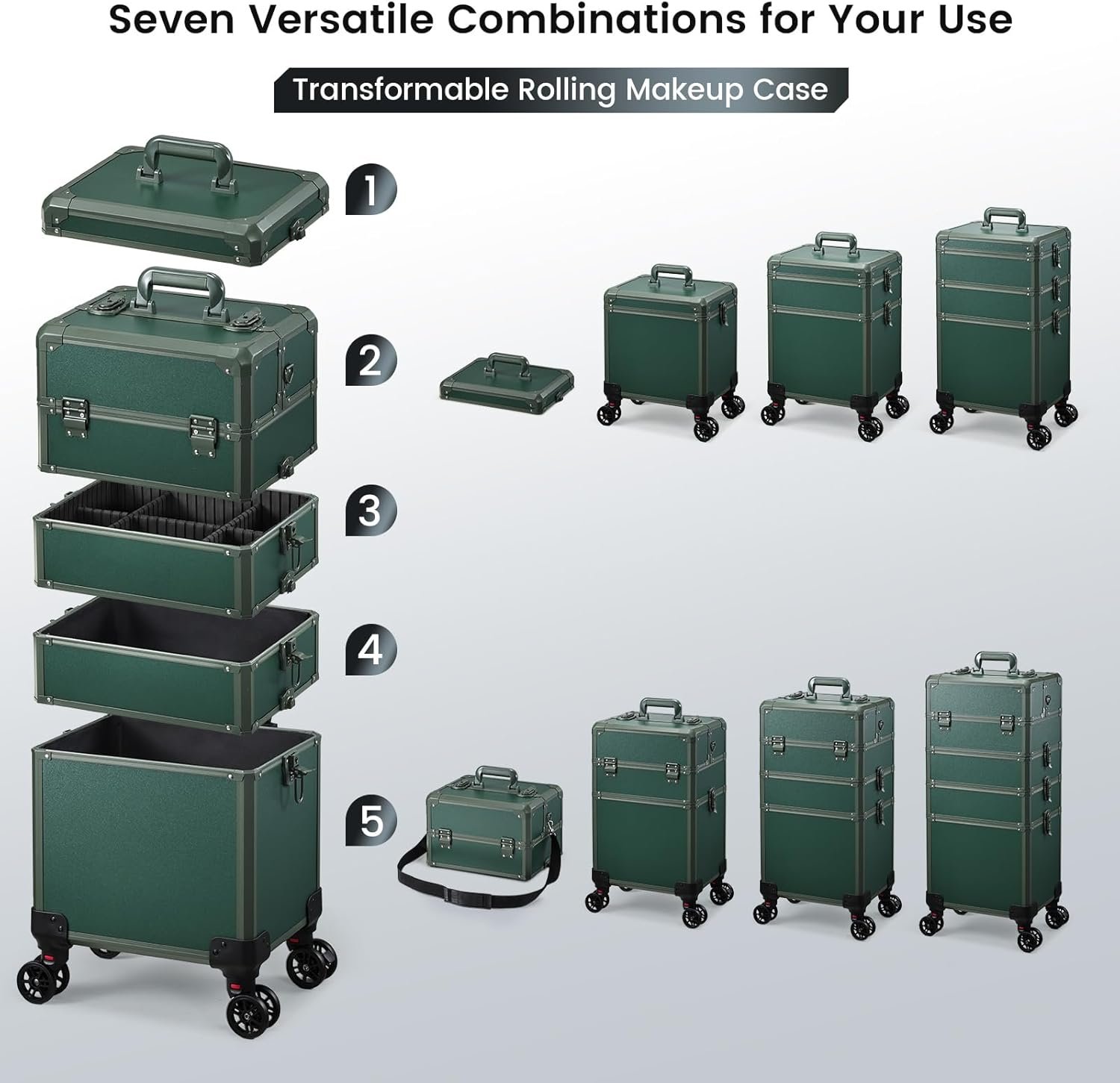5-in-1 Makeup Rolling Case: This cleverly designed cosmetic rolling case is a versatile storage solution for professionals and individuals. It has four removable trays and a lid, allowing you to arrange it in seven different ways. You can combine all the parts for a complete 5-in-1 case, or separate them into 4-in-1, 3-in-1, or 2-in-1 configurations. This flexible design lets you customize the case to fit your specific needs and the amount of cosmetics you have. It’s a convenient and adaptable storage option.