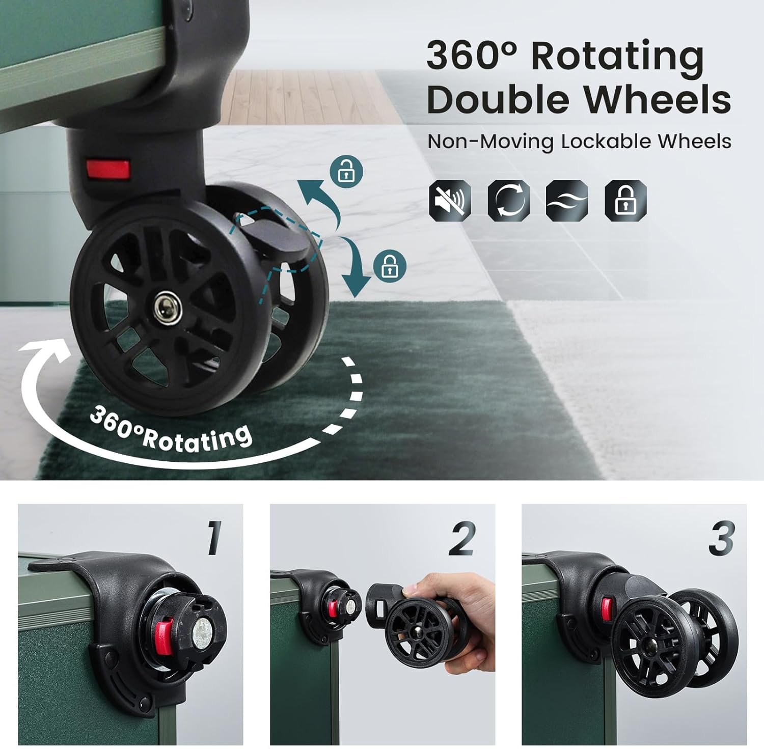 360-degree swivel wheels: This rolling suitcase has four high-quality wheels that spin 360 degrees. This makes it easy to move smoothly and quietly. The wheels glide easily, so you don’t have to work hard to pull the case. You can also take the wheels off for easy replacement or when not needed. This makes the suitcase more versatile and lasts longer. Two of the wheels have brakes to keep the case from moving when you use it.