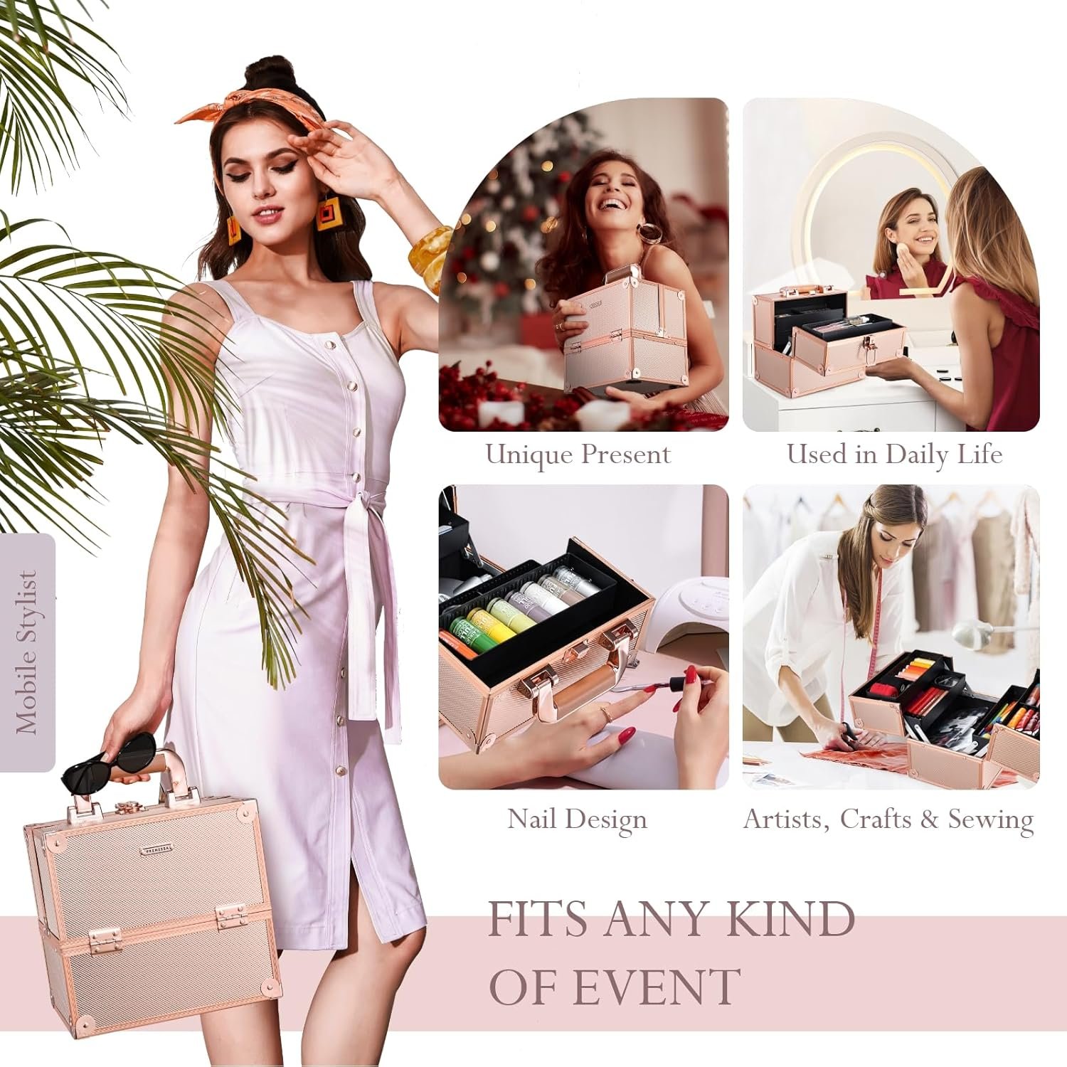 Rose Gold Sturdy Makeup Case: This sturdy makeup case organizes and carries cosmetics effortlessly. Its portable 9.84″x7.08″x9.33″ size suits travel and daily use for all skill levels. Durable ABS aluminum construction with metal reinforced corners protects contents from impact, extending lifespan. Lightweight yet exceptionally durable, this case balances portability and lasting performance for on-the-go use.