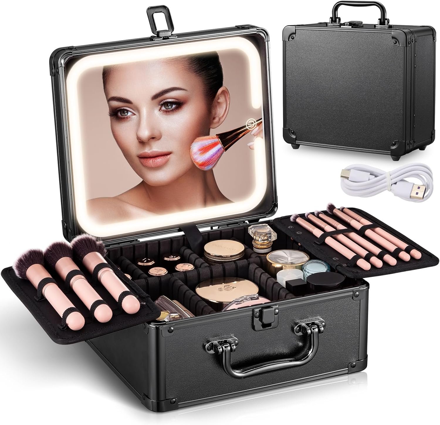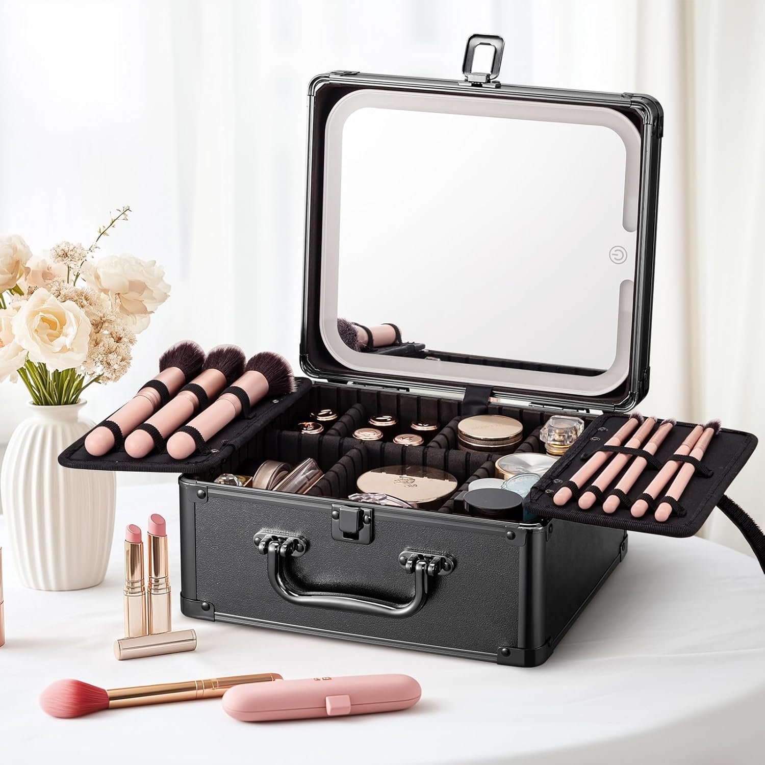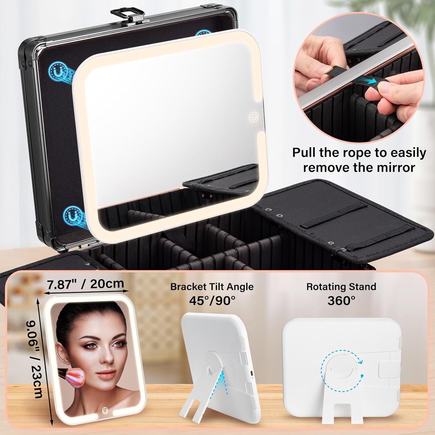 【Lighted Makeup Case Organizer with Detachable Mirror】– This mirror features an innovative magnetic design, can be disassembled for use. It is equipped with 4 hidden magnets, enabling the mirror to be securely attached to any metal surface items. Additionally, the mirror comes with a rotatable support stand that can rotate 360°, supporting both vertical and horizontal orientations. Whether used inside a makeup case or detached for standalone use, this mirror is highly convenient and meets various makeup needs in different settings