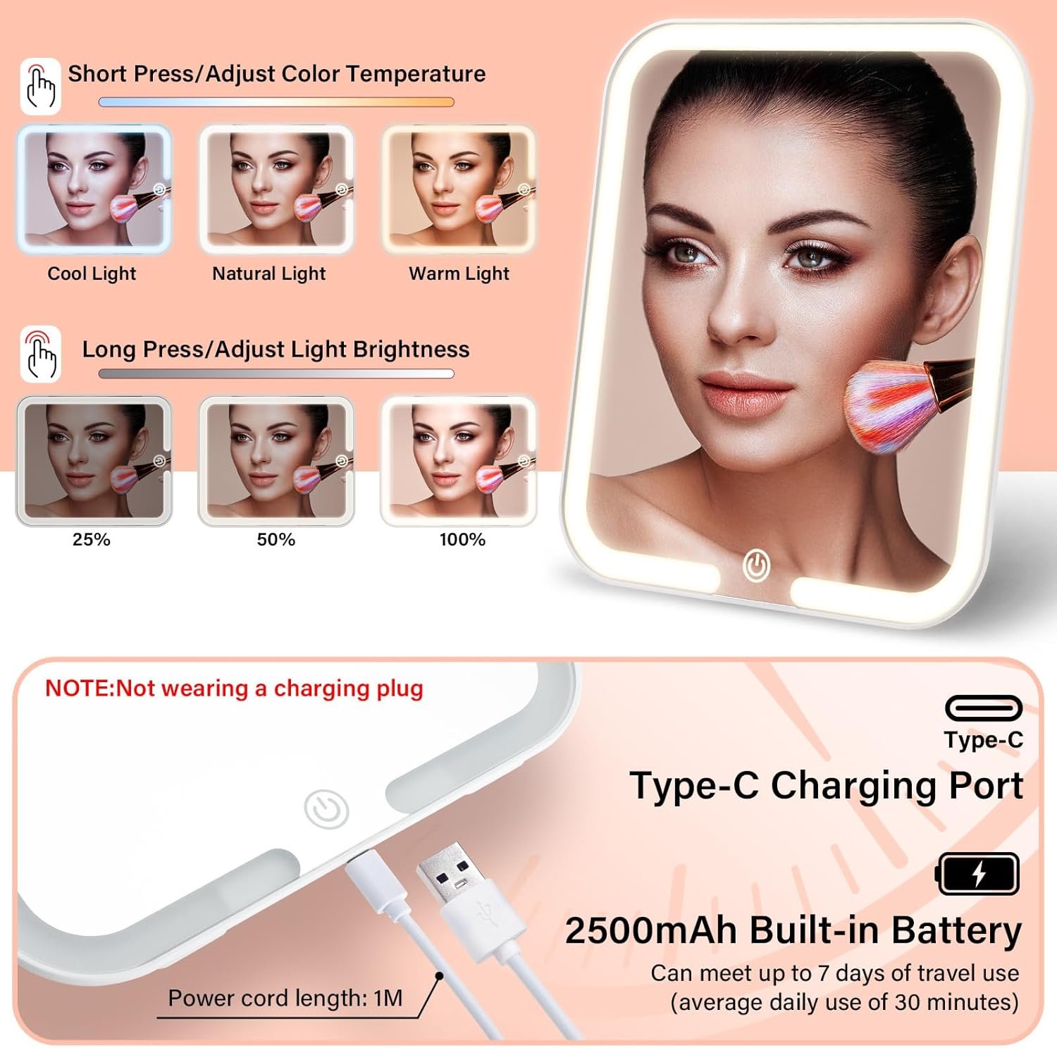 【Intelligent Lighted Mirror】– It features a mirror and LED lights. Long press the switch to adjust the light brightness ( luminance from 0% to 100%) and short touch to adjust the light color temperature (cold light, natural light, warm light). Perfectly simulating daylight, meaning you will always have the right lighting and no longer need to be tied down to one place. Also, LED light with 2500mAh high-capacity battery, long service life, can recharge it conveniently with USB-C or a power bank