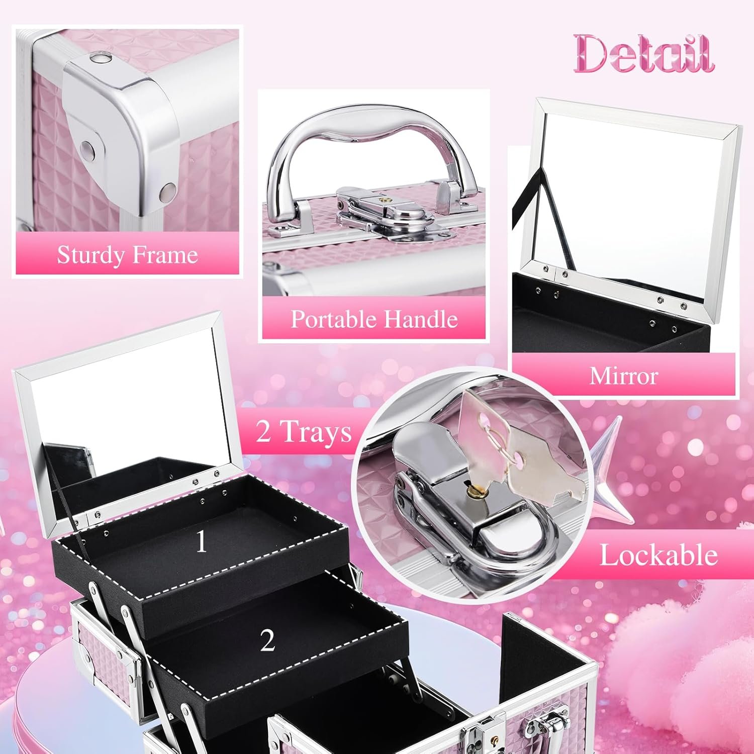 Elegant Pink Makeup Case: Measuring 7.7 x 5.9 x 6.3 inches, this travel makeup case is perfect for young girls. Crafted from lightweight ABS with aluminum and metal-reinforced corners, it offers exceptional durability and wear resistance. Plus, its waterproof surface ensures your cosmetics stay protected during outdoor events.