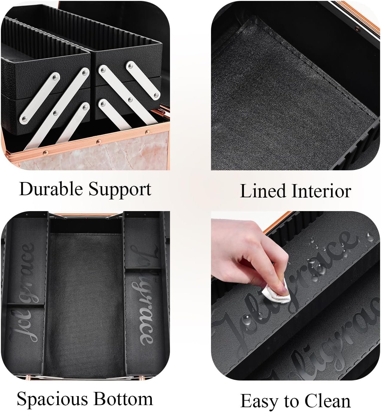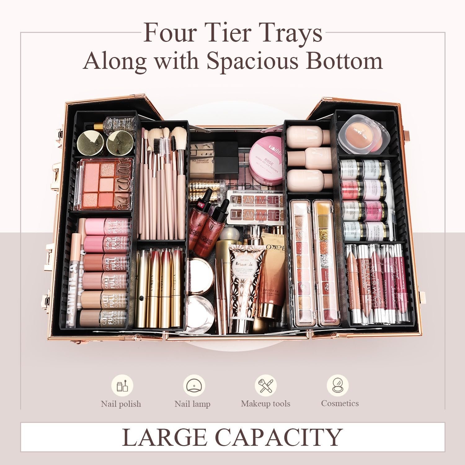 Makeup compartments adjusted with 2 plates for each tray.Keep brushes and lipsticks stay in place.