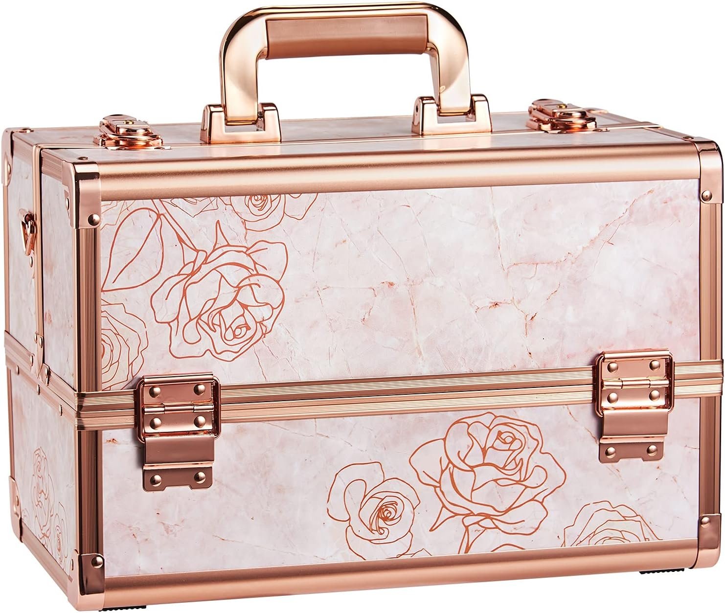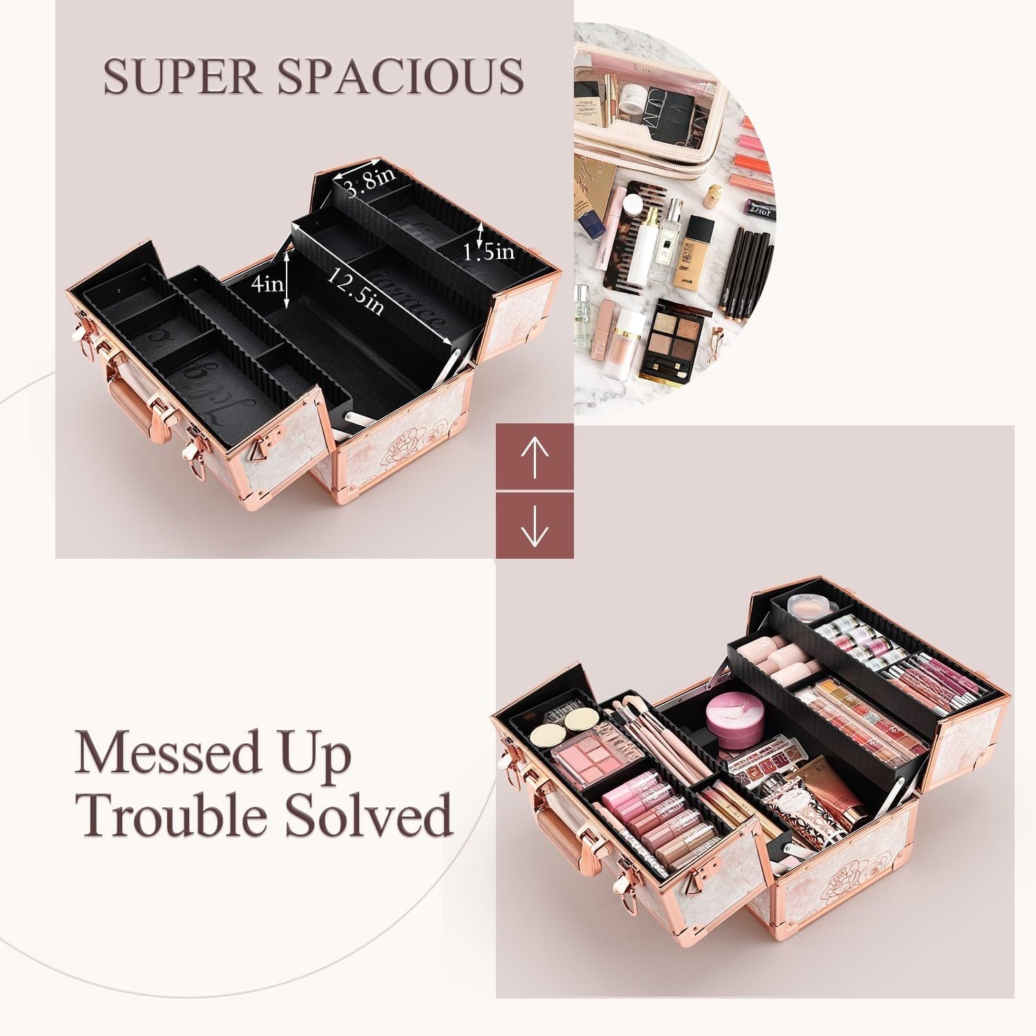 This 13.5-Inch large makeup case is your best cosmetic storage solution that can be used both at home or travelThe rose gold color and marble rose pattern make the case a unique gift for womenSpecially made for large/full size palettes