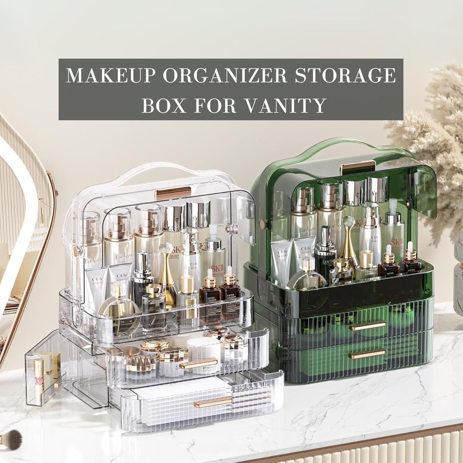 Upgrade Makeup Organizer Box: This elegant cosmetic storage box is large-capacity without assembly, it features 1 extra large storage space with a flip lid, 2 large drawers, and 1 small drawer on each side for storing lipstick, the top layer is suitable for bottled lotion, cream and sunscreen,2 separate drawers can store jewelry, lipstick, palette, makeup brush, eyeliner, eyebrow pencil, eye shadow, nail polish, perfume bottle or other skin care cosmetics.