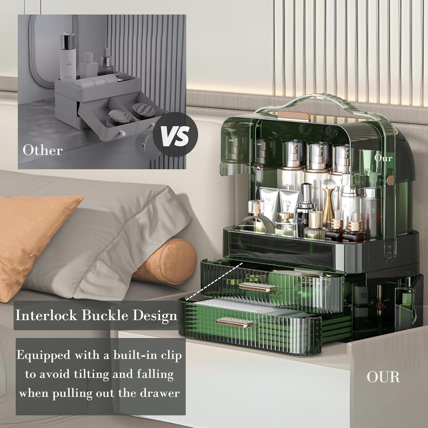 Store More Yet Spacesaving: our large capacity cosmetics storage with drawers can store up to 14 tall bottles of water emulsion, 6 essence bottles, 4 lipsticks, 6 eyeshadow palettes, 6 loose powder containers, and even some jewelry. It is a great space saver for a vanity desk, bathroom counter, bedroom, and dressing room.