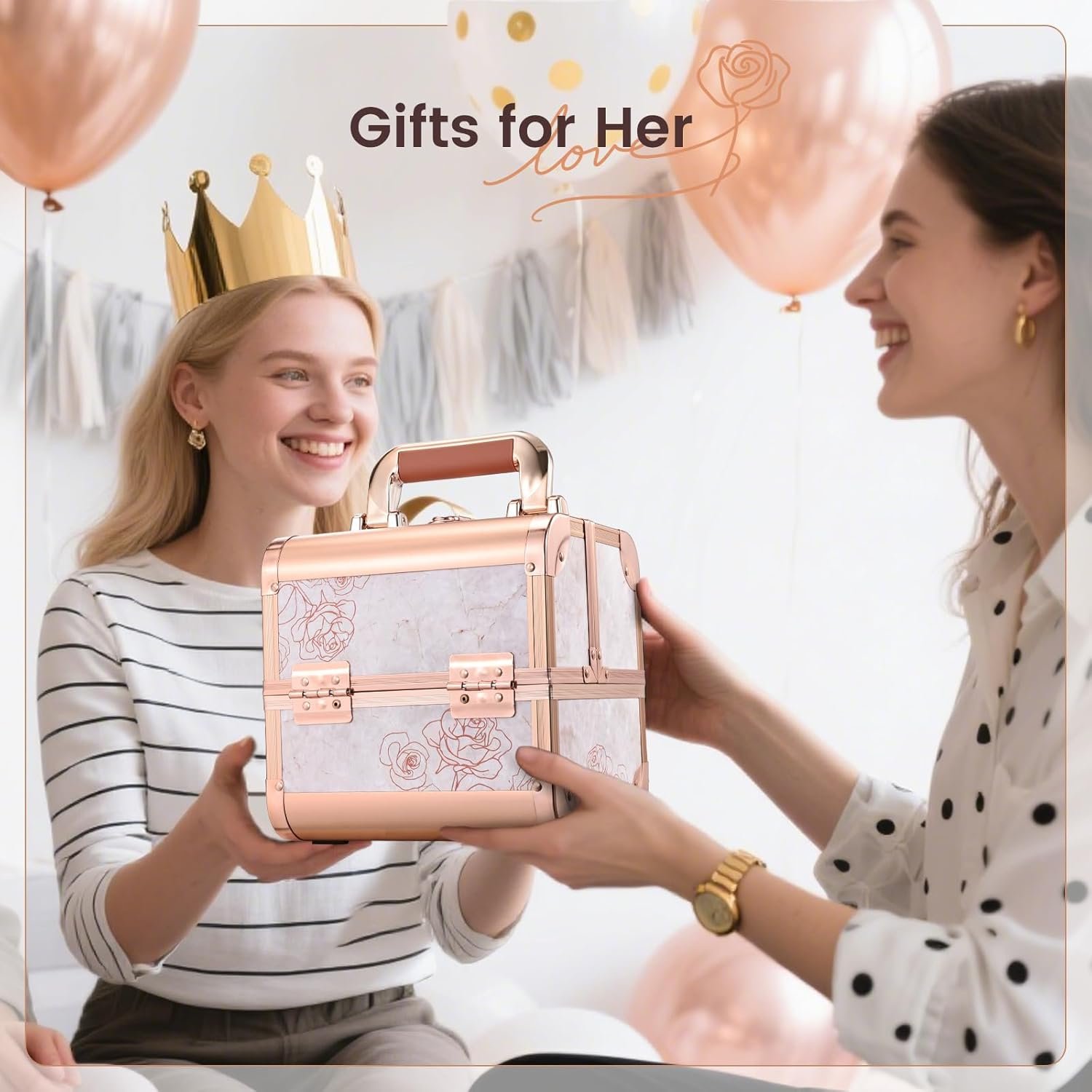 Chic Makeup Case: Designed for your little princess, the Rose Gold Flower Train Case is a trendy, portable makeup storage solution. Measuring 8″ by 7″ by 7″, it’s perfect for slumber parties or mini spa sessions. Made from durable ABS material with metallic accents and reinforced corners, it combines lightweight portability with excellent durability for travel or everyday use.