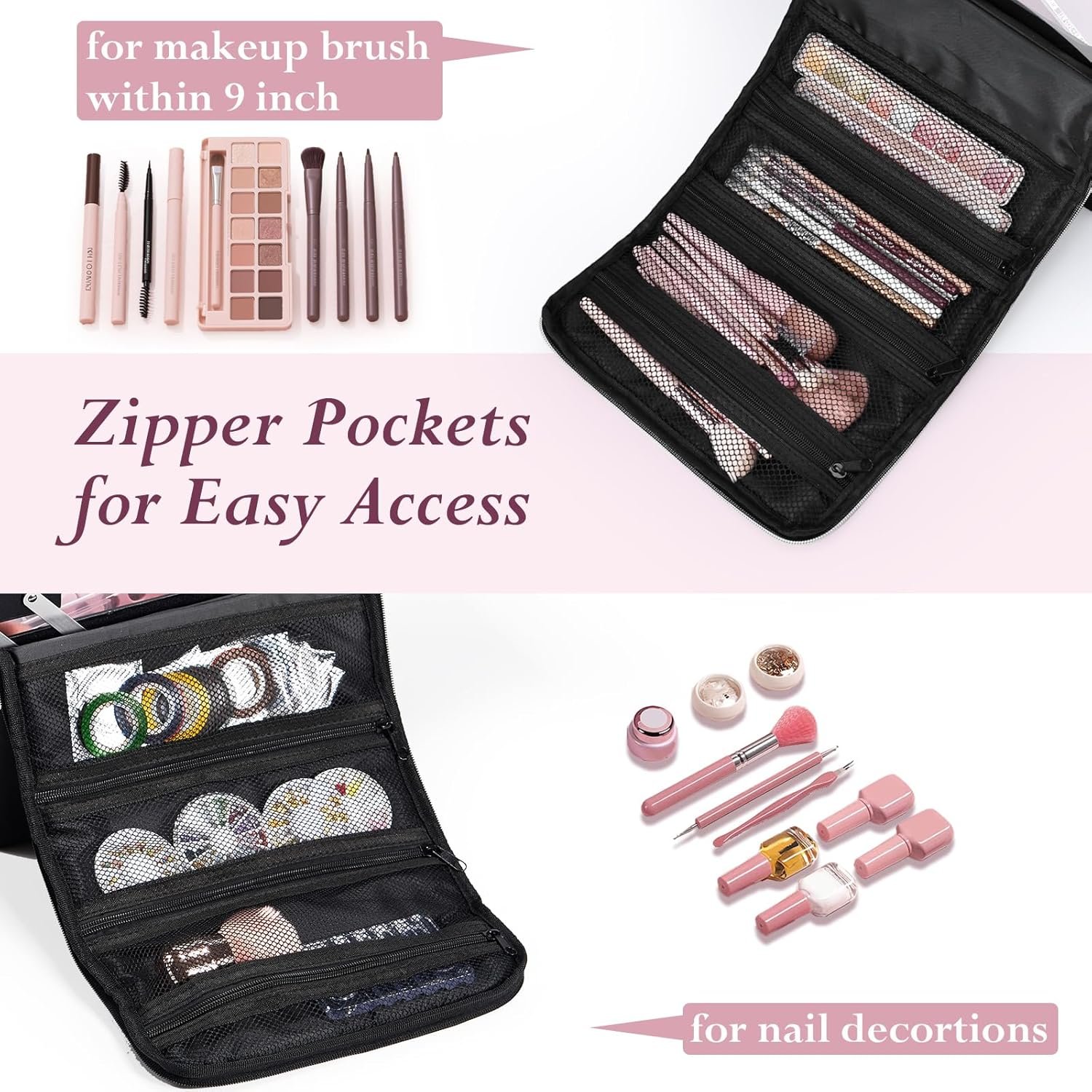 **Professional Travel Makeup Bag With 4 Tiers**: 4 extendable trays of this cosmetic bag makes it easy to keep your makeup supplies, nail art decor, eyelashes extension kit, makeup brushes neat and tidy. Great for women or girls who have tons of small items