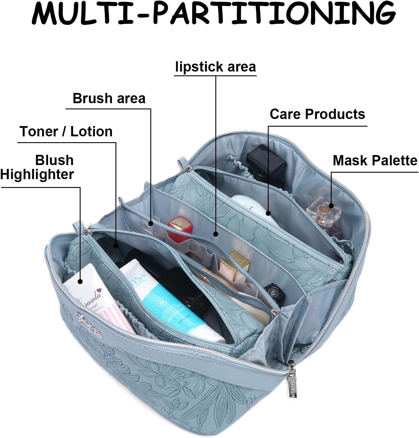 Customers find this makeup bag to be of high-end quality and appreciate its pretty design, with one noting its nice pattern. The bag is spacious, accommodating all makeup and brushes, and features compartments that keep everything organized. Customers praise its travel-friendly size, particularly for tiny hotel bathrooms, and its robust zippers that are easy to open and close. They like the color options, with one customer specifically mentioning the pale blue shade.