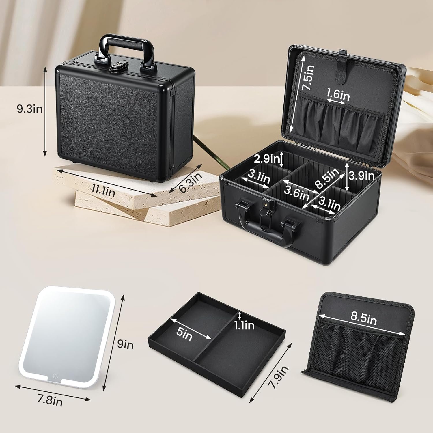 【Multifunctional Makeup Train Case Organizer】– Features 6 removable EVA compartments for customizable storage. Adjust the shock-absorbing foam inserts to fit makeup palettes, nail lamps, or cosmetic tools. Perfect for travel makeup cases – protects fragile items while on-the-go. A must-have professional makeup organizer for women.