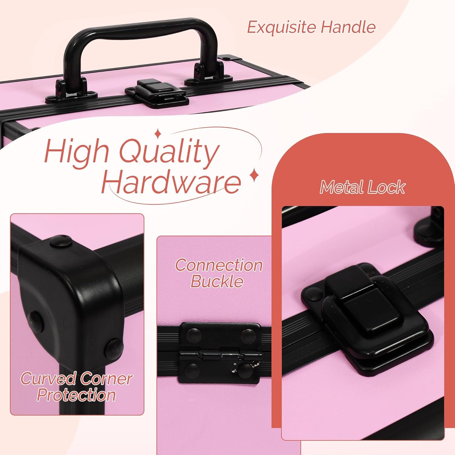 🎀 EXCELLENT CRAFT – Our makeup train case frame is made of durable and sturdy A-grade aluminum, with reinforced connection buckle and high-quality metal corner providing extra durability and protection for cosmetic box. The exquisite lock clasp ensures that cosmetics won’t spill and also ensures privacy and security when traveling.