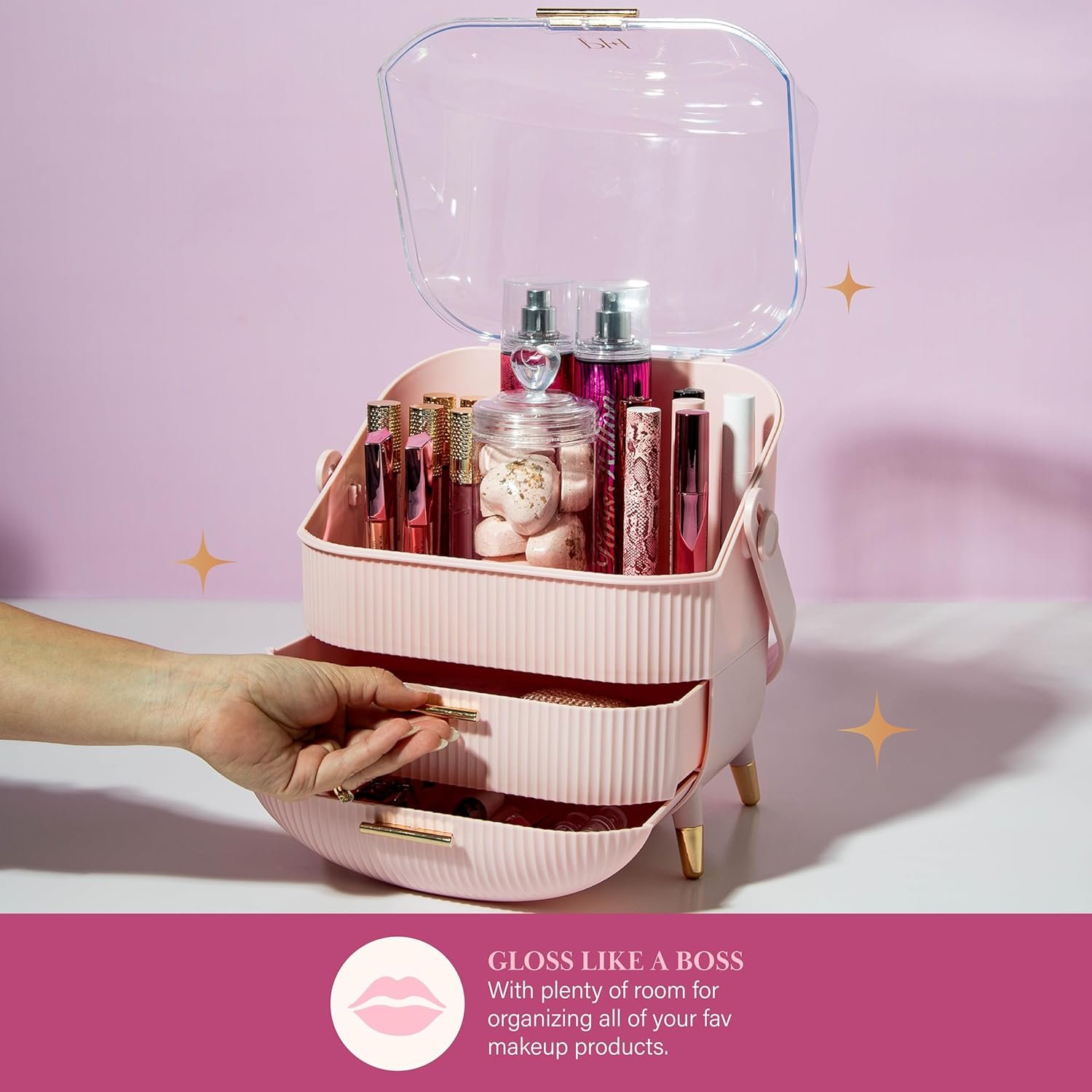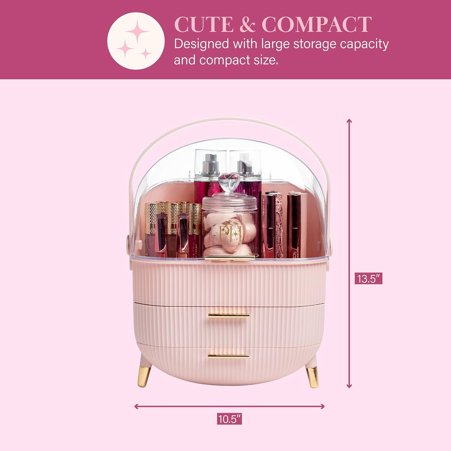 Get ready to slay your storage with this gorgeous large-capacity cosmetics organizer! It’s the perfect home for all your beauty essentials—think skincare, makeup, perfume, jewelry, and even those must-have toiletries. You’ll create a beautifully organized space where everything is easily accessible and easy to find! This storage solution adds glamour and function to your vanity with its stunning fluted design and chic gold detailing. And don’t worry about fitting all your favorites in; the epic drawer storage has you covered! Those two adorable drawers can hold everything from entire eyeshadow palettes to lip glosses and even your favorite earrings and hair accessories. And let’s not forget the sliving see-through lid! With its crystal-clear folding design, you can easily find your go-to cosmetics. The lid stays open when lifted—perfect for quick access to your fave skincare and makeup products! Plus, this beauty is compact and portable, featuring a built-in carry handle for easy transport. It fits snugly on your bathroom vanity or nightstand, making it a must-have for any beauty lover!