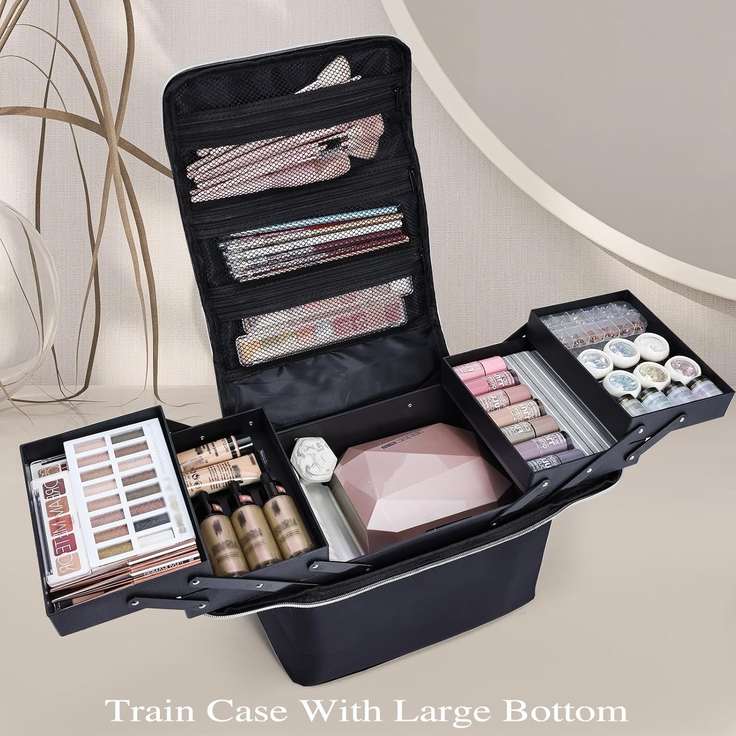 4 trays for organize your small tools.Wider opening at top of case for easy access to makeup products.