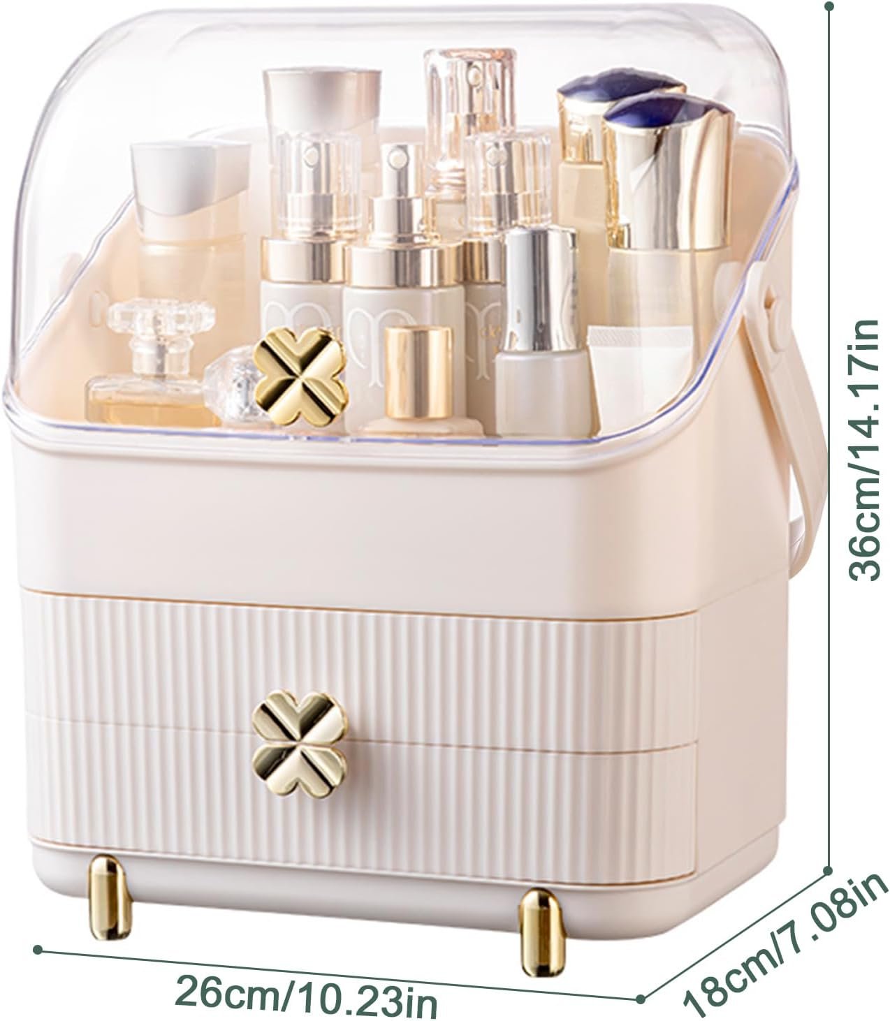 EXTRA LARGE CAPACITY BEAUTY ORGANIZER CASE: our dustproof makeup organizer box with cover stores your cosmetic items of different shapes and sizes while keeping them well organized. It can hold your jewelry, lipsticks, makeup brushes, all types of makeup, nail polishes and clippers, skincare and perfume bottle, and much more.