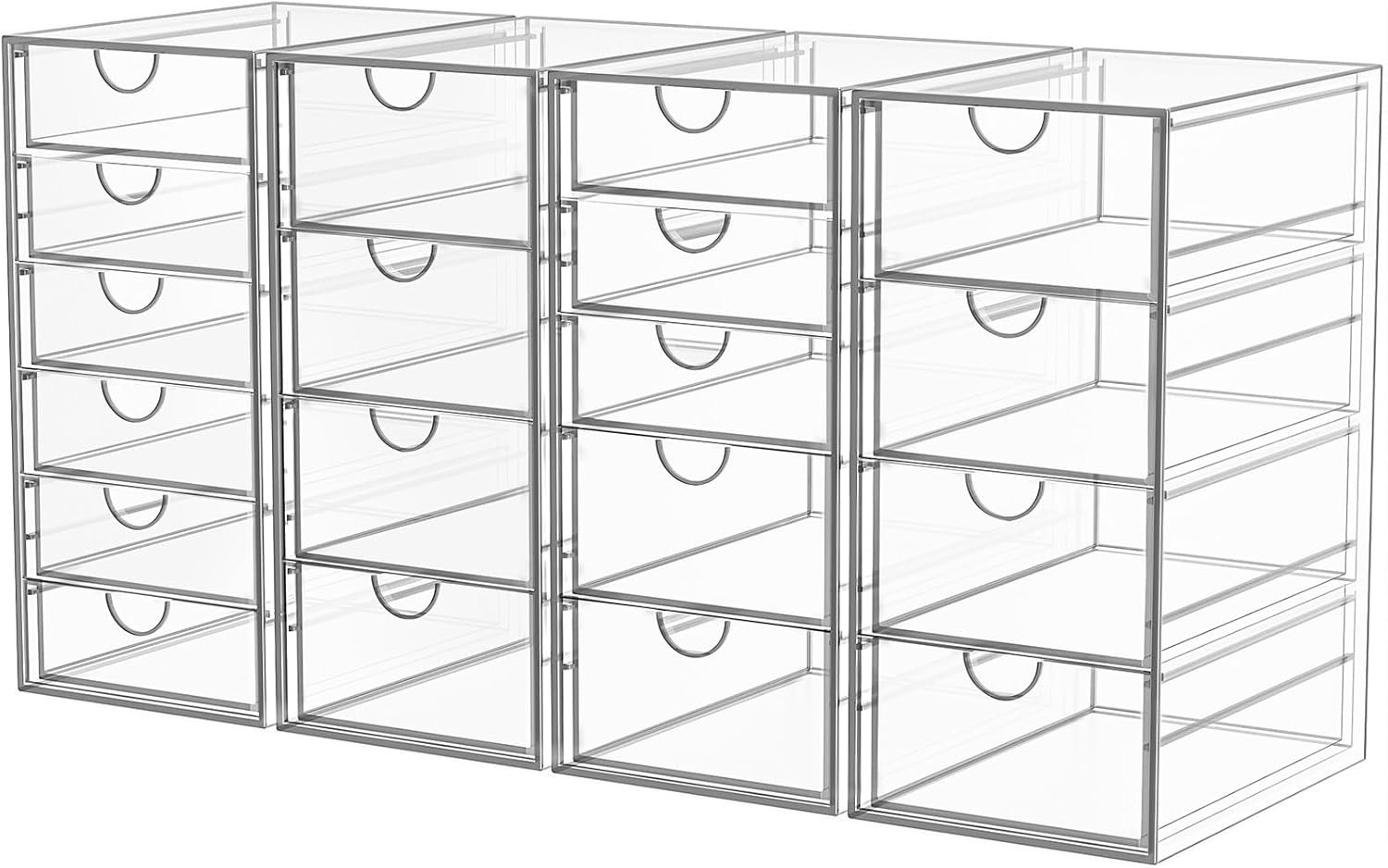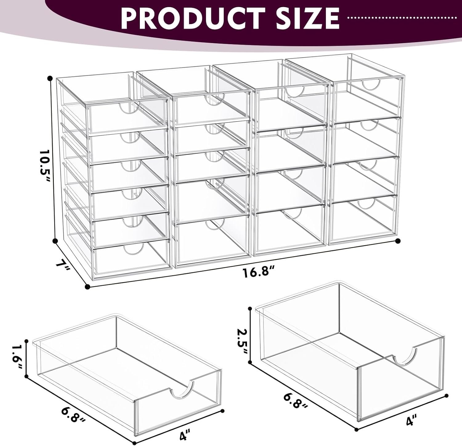 4 Pack makeup organizer with 19 Drawers: Our Acrylic makeup bathroom organizer can maximize space on shelves, dressers ,under the sink, and bathroom counters. There are 19 drawers in total, it’s perfect to organize all your messy items into section, and very easy to take. You can also use them side by side, put your small objects on top of acrylic bins to make your countertop space more tidy. And 4 Pack storage bins with 19 drawers are also enough for you to place in multiple places, very good value.
