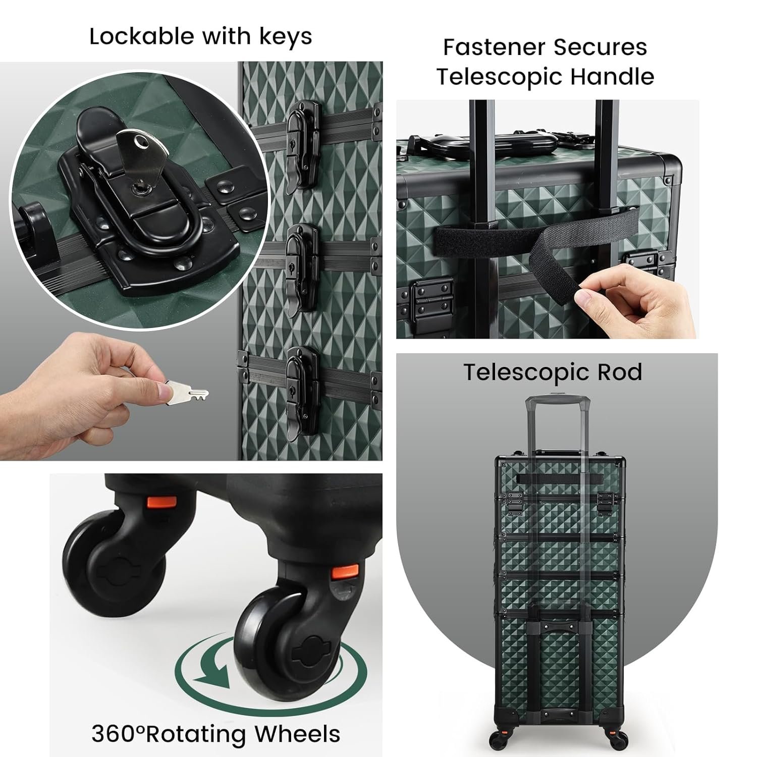 Cosmetology Case on Wheels: This train case is equipped with four high-quality 360-degree swivel wheels, which ensure smooth and silent movement, making it more labor-saving and easier to maneuver. The wheels are designed for effortless gliding, reducing the physical effort required to move the case. Additionally, the detachable wheels are practical and convenient, allowing them to be easily removed or replaced when necessary. This feature adds flexibility and extends the longevity of the train case, making it a reliable choice for various needs.