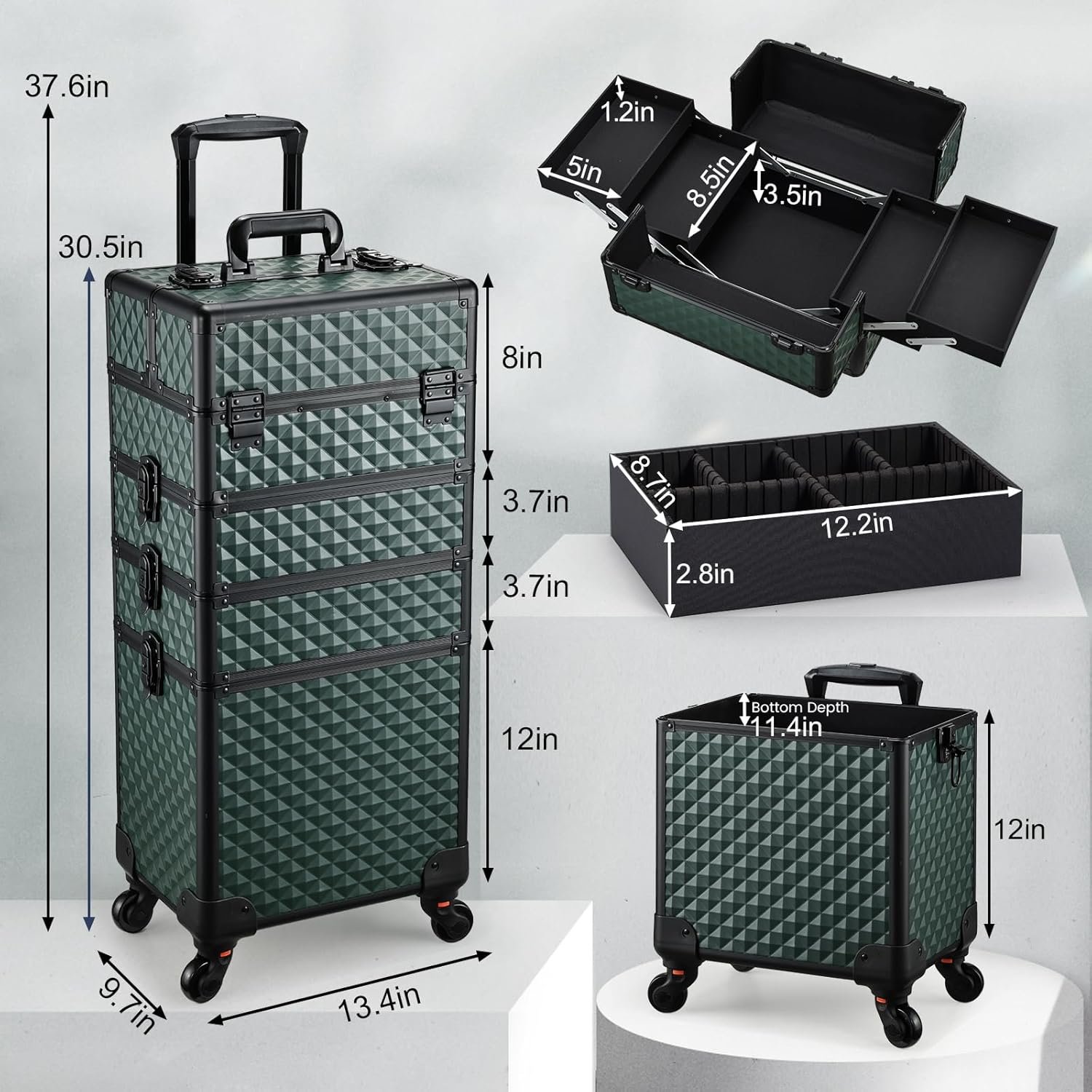 Large capacity Rolling Makeup Case: The separated middle tray with removable baffle smart match. According to the different size of gadget, you can arranged space, not only neatly placed items and can be fixed to prevent shaking and falling damage. There is also a large bottom has a great storage for hair styling tools, cosmetics and nail tools. Perfect for professional makeup artists, hairstylists, manicurists, tattoo artists or those who have a mountain of cosmetics.