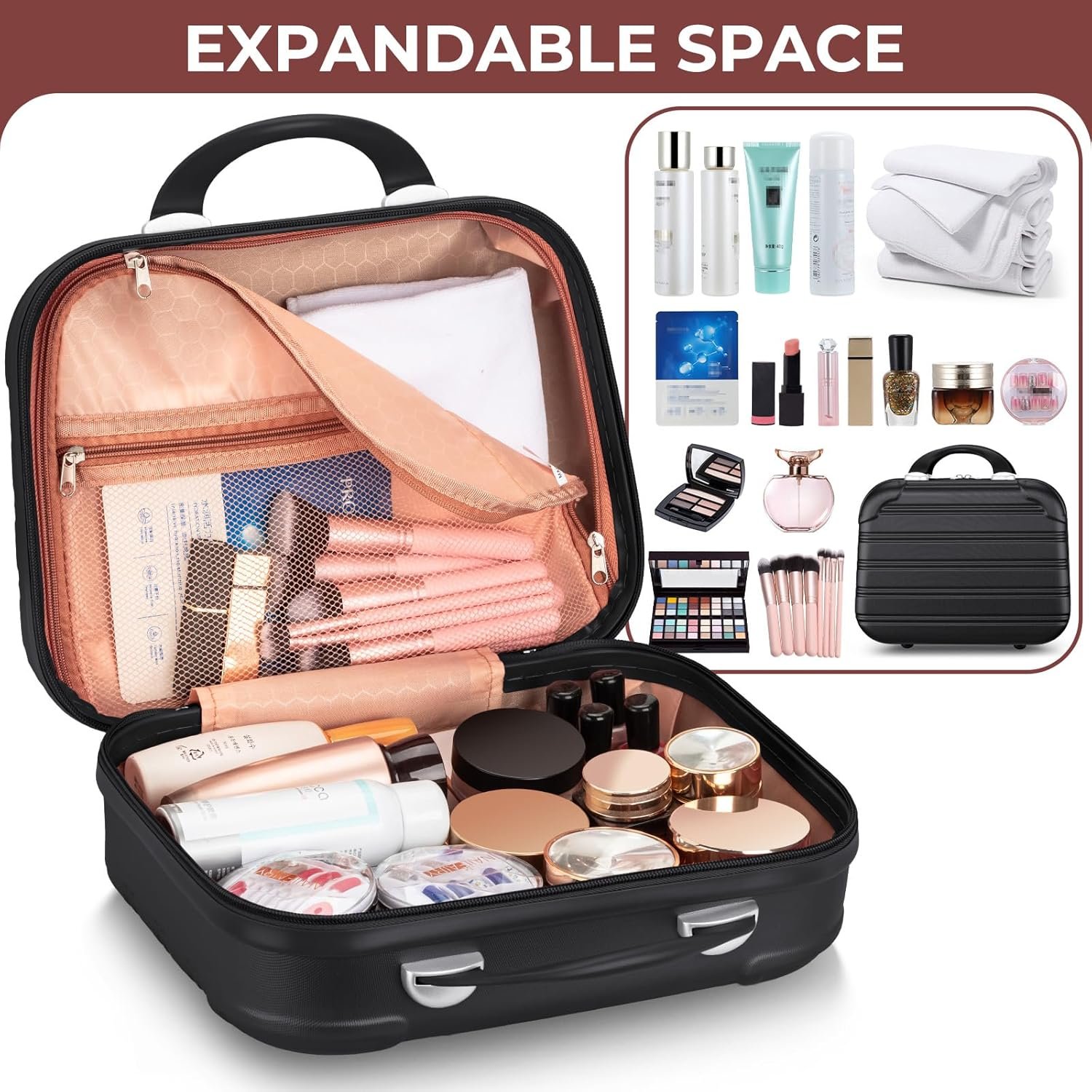 【Spacious Multi-Layer Organization】– This suitable 14-inch size makeup case featuring two spacious main compartment and a multiple mesh pocket, which can store all your travel essentials, including cosmetics, toiletries, personal clothing, and jewelry. The simple inner design makes it light enough but convenient to classify your cosmetics, keep your cosmetics neat, organized and within reach