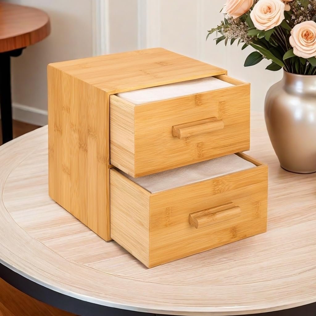 Double-drawer Bamboo Container for Face Towelettes DisposableDouble-drawer Bamboo Container for Face Towelettes Disposable