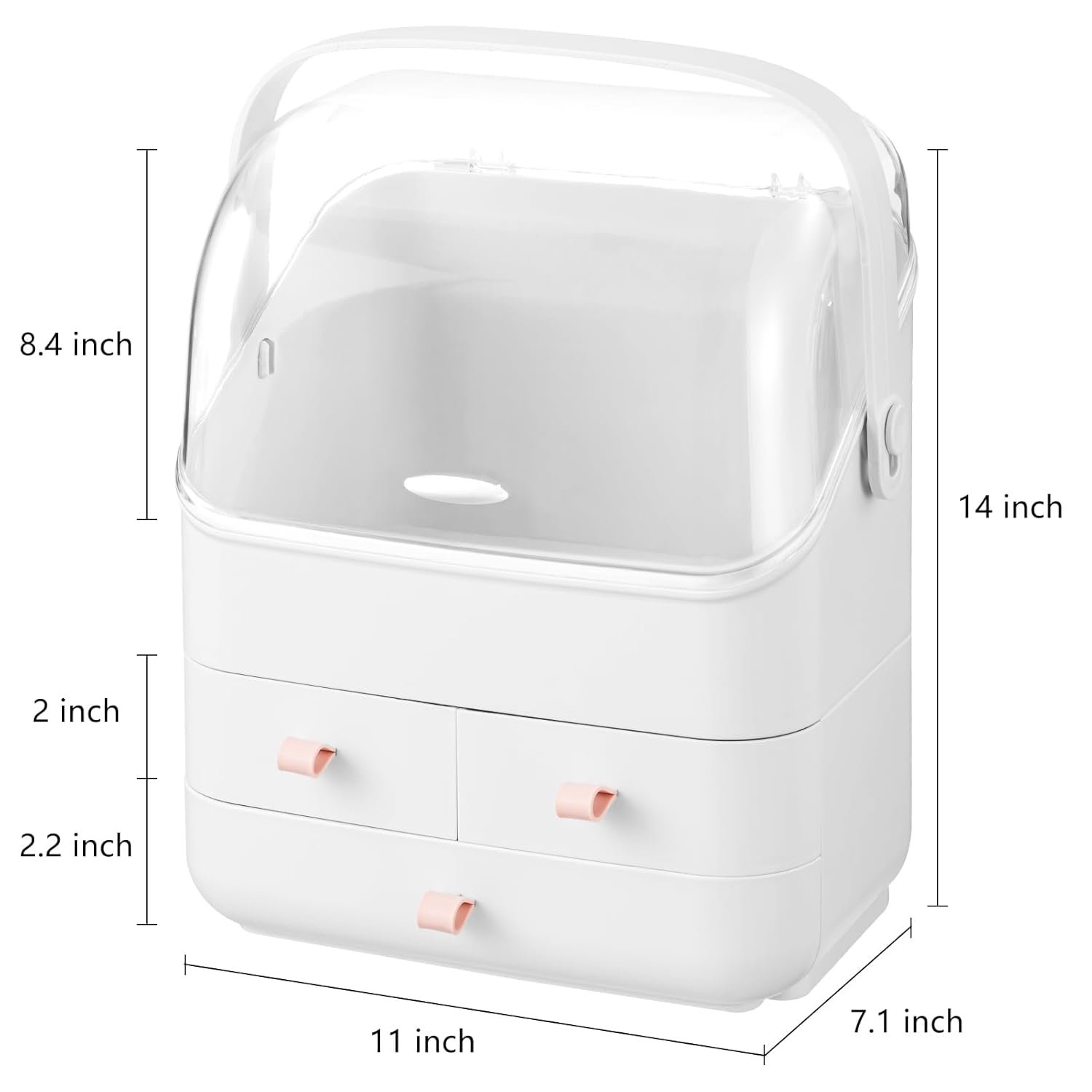 【STYLISH AND PRACTICAL】This dust-free cosmetic organizer has a crystal clear top lid with a white finished body and cute handles, making it a stylish addition to any room decor. Whether it’s in your bedroom, bathroom, dressing room, nightstand, dresser or countertop, it blends in perfectly.