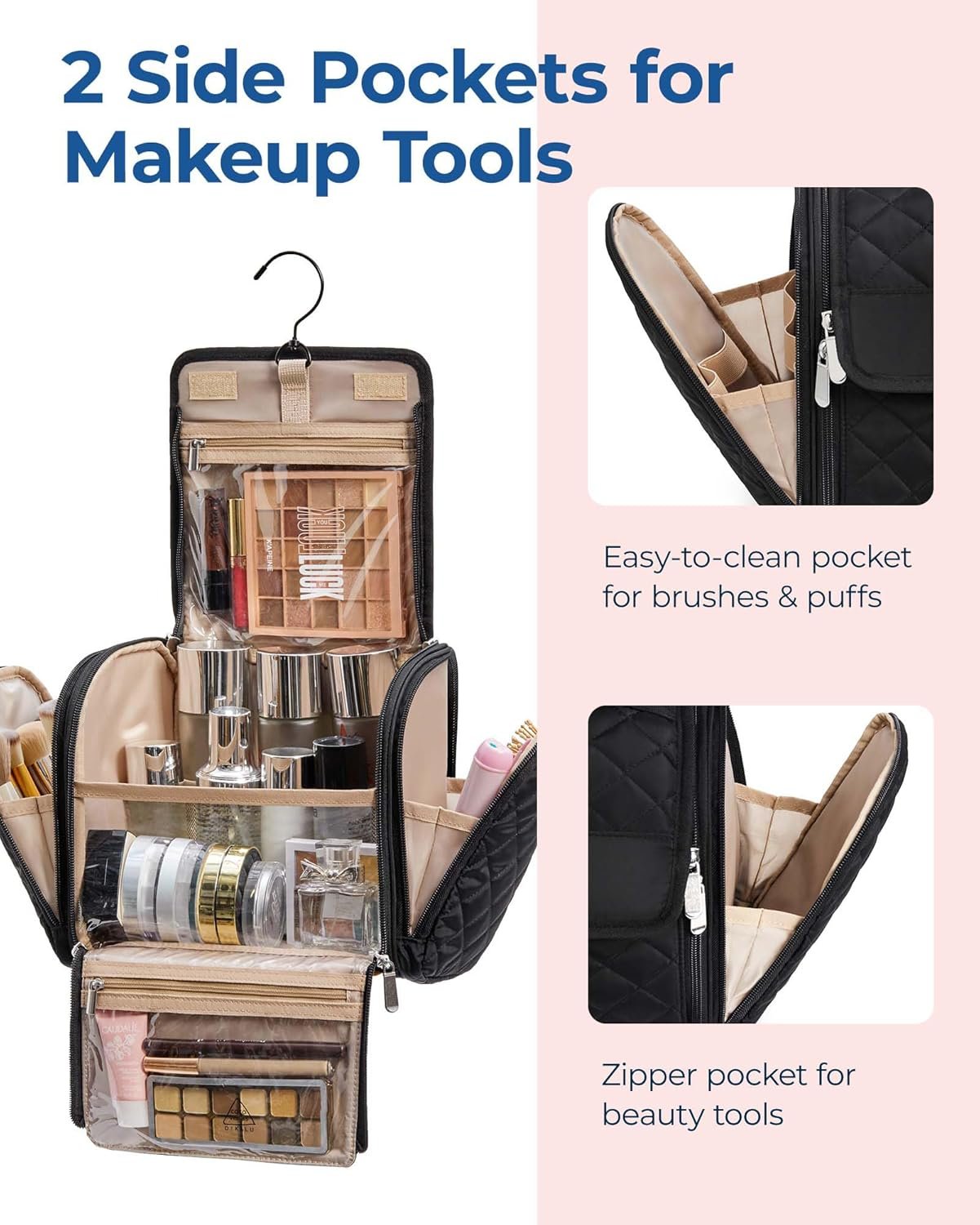Customers find the makeup bag roomy and well-organized, with separate pockets for small items and a deep inner space. They appreciate its durability, travel-friendly design, and the ability to hang it on hooks, with one customer noting it hangs neatly in the bathroom. The color receives positive feedback, and customers like the zipper quality, though some mention the main compartment doesn’t zip properly.