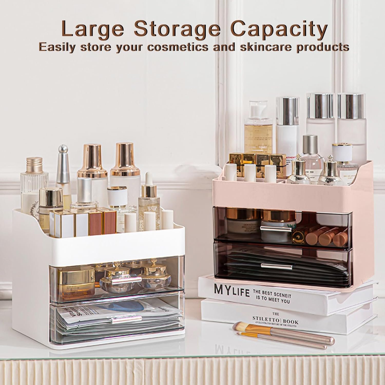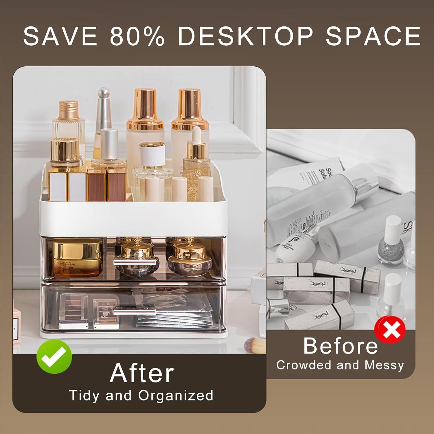 【Large Capacity】DASITON makeup organizer has 2 spacious drawers and 4 large open top compartments, providing plenty of space to neatly store and display your cosmetics, skincare products and accessories.Size: 8.66*7.08*7.28 inches