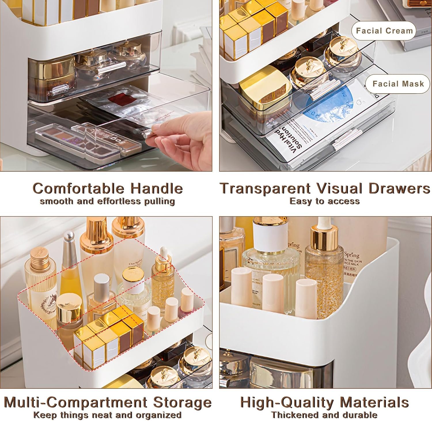 【High-quality and durable material】This skincare organizer is made of thickened ABS+PET material, which is not easy to break and durable. The bottom drawer pulls out smoothly, and the transparent structure allows you to easily identify and access your items at a glance, making it an ideal choice for storing cosmetics and makeup tools