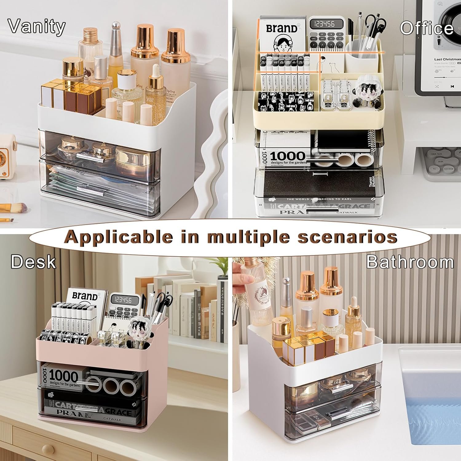 【Multi-purpose】This cosmetics organizer is perfect for dressing tables, bathroom counters, and office desks. It can not only store cosmetics and makeup tools, but also easily store skin care products, jewelry and even office supplies. It can be used as a vanity organizer, bathroom organizer and desk storage box, suitable for a variety of scenarios