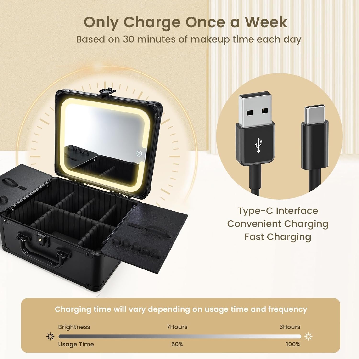 【ONLY CHARGE ONCE A WEEK TRAVEL CASE】- The LED mirror is equipped with a built-in 2000mAh battery, alleviating concerns about battery life during use. Based on an average daily makeup time of 30 minutes, it typically requires charging only once a week. It is important to note that charging duration may vary depending on usage time and frequency.