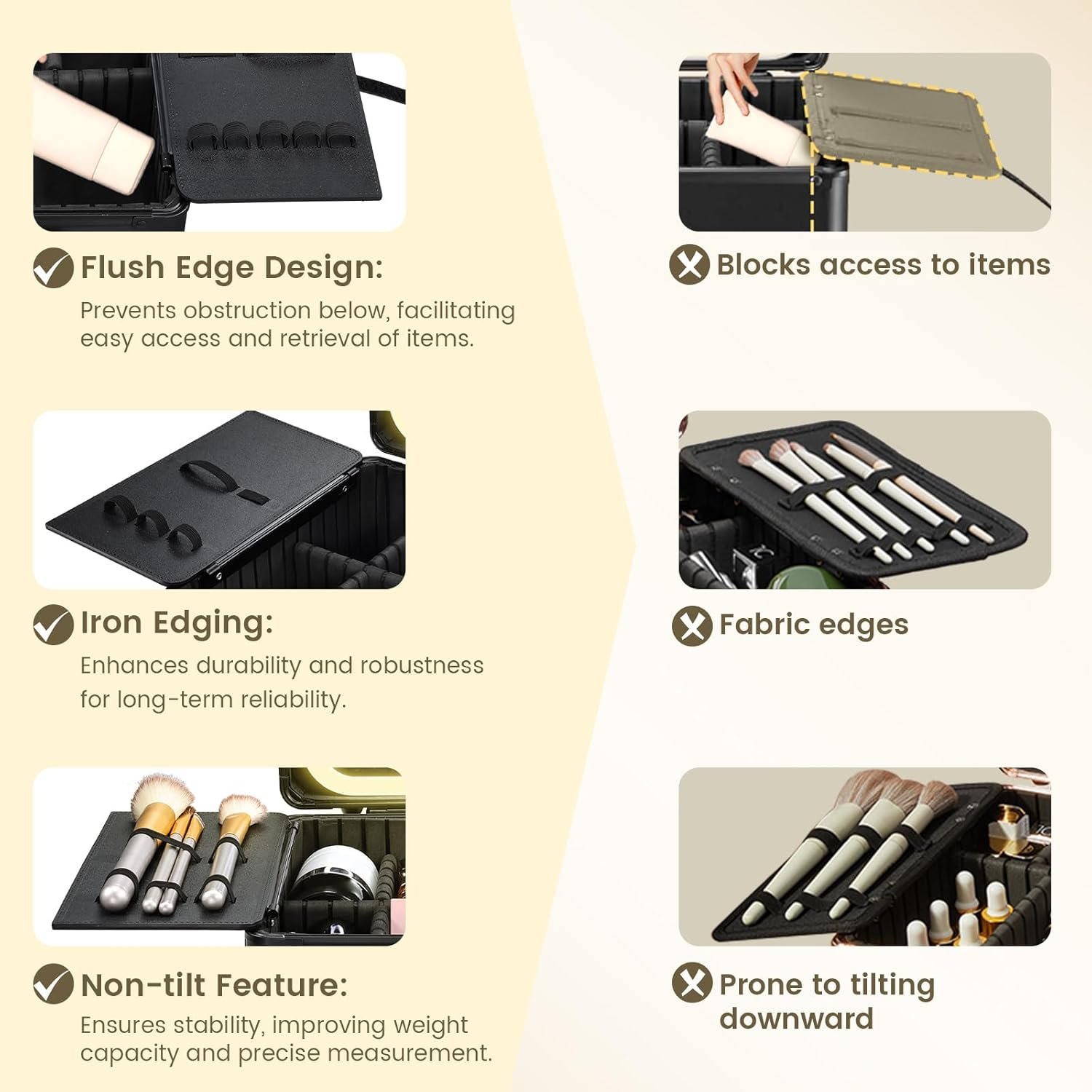 【ALL-IN-ONE MAKEUP BOX ORGANIZER】- This makeup box features six removable EVA partitions and two brush storage boards for tailored organization. The shock-absorbing sponge pads safeguard your cosmetics, while the partitions are waterproof and simple to maintain.