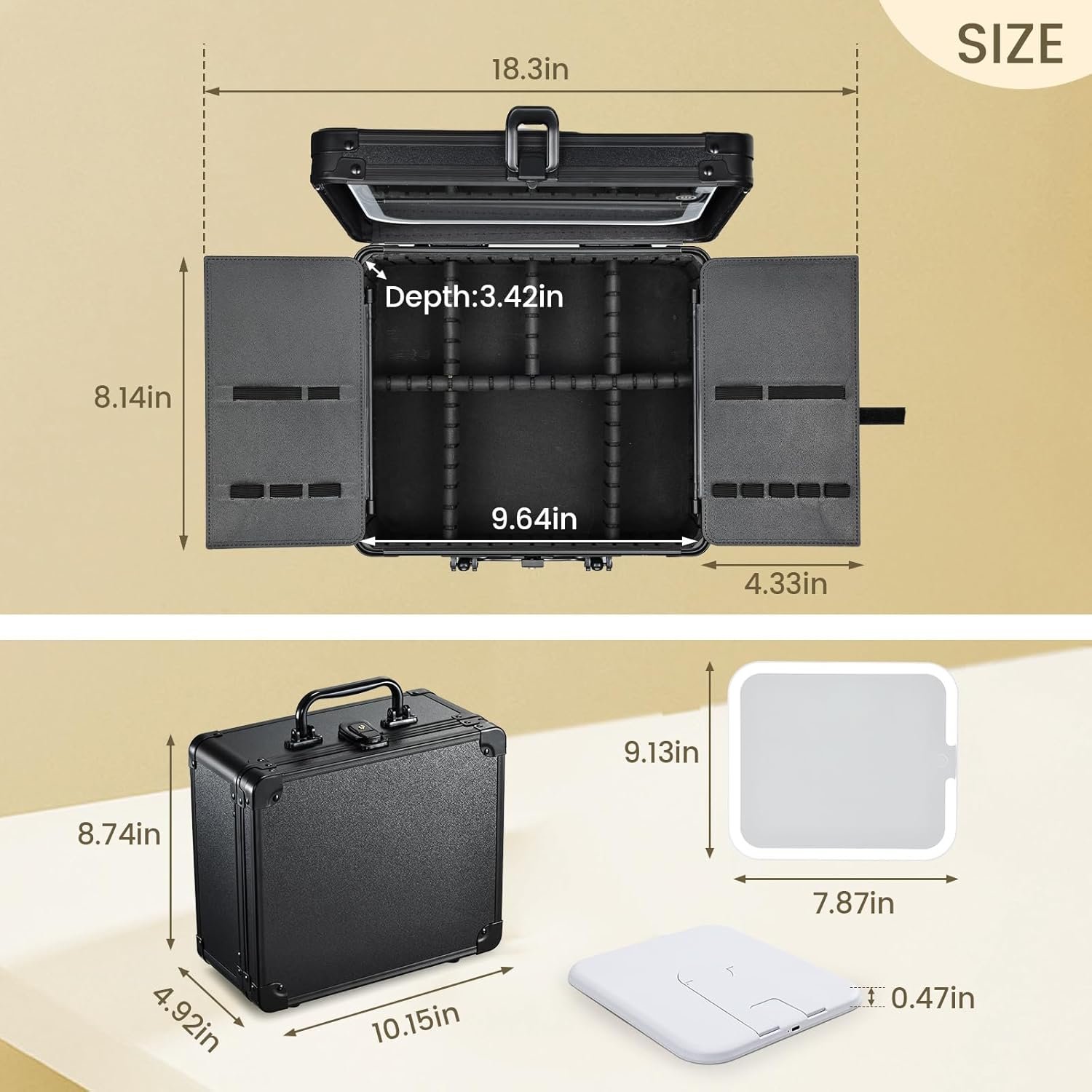 【3 COLOR FILL LIGHT MIRROR MAKEUP CASE】- Makeup case with a smart full-screen illuminated mirror that can be independently removed for use. The mirror features a 360° swivel bracket and can tilt at angles of 30°, 60°, and 90°, making it perfect for use on a desk. A gentle touch of the switch allows for effortless adjustment between cold, neutral, and warm color temperatures, while a long press can vary the brightness from 0% to 100%.