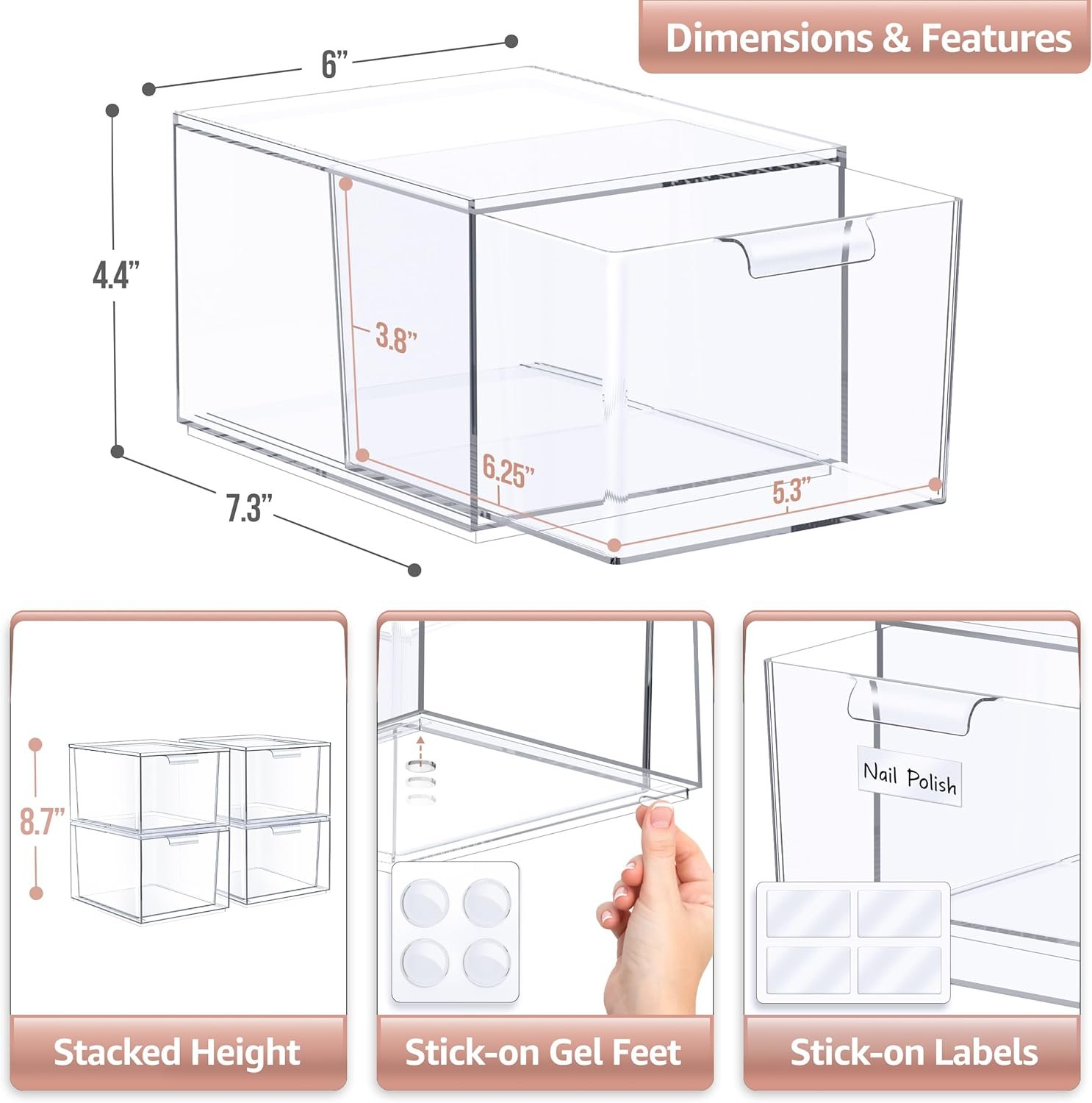 Design Details: The Sorbus Acrylic Storage Containers help reduce clutter, gain space, and save time getting ready – Stackable storage drawers slide open smoothly with easy-to-grip handles – Includes anti-slip grip – Each container measures approximately 7.4in x6in x 4.4in