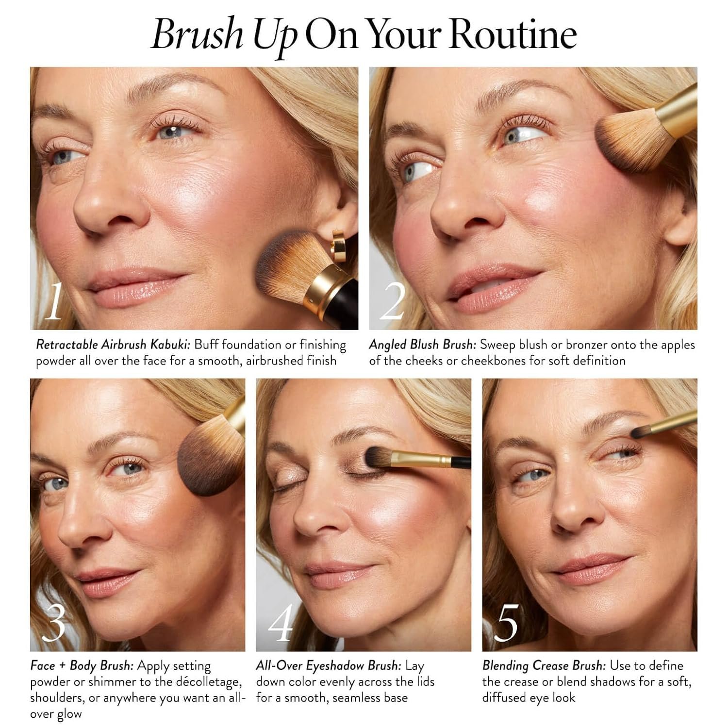 HOW TO USE: Retractable Airbrush Kabuki Brush: Swirl or dip the brush into powder and gently tap off any excess. Apply to skin using sweeping, circular motions. For fuller coverage, apply using a patting motion. Angled Blush Brush: Sweep blush or bronzer across the apples of your cheeks and blend out toward your hairline. Classic Bronzer Brush: Sweep the bristles over the high points of the face for an all-over glow. All-Over Eyeshadow Brush: Glide the brush over shadow and sweep it across lid
