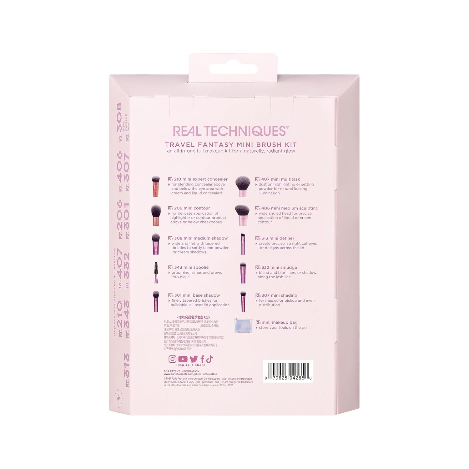 The Real Techniques Travel Fantasy Mini Brush Kit is an all-in-one full makeup brush set for a naturally, radiant glow. The makeup brush kit includes the 210 Mini Expert Concealer Brush, 407 Mini Multitask Brush, 206 Mini Contour Brush, 406 Mini Medium Sculpting Brush, 308 Mini Medium Shadow Brush, 313 Mini Definer Brush, 343 Mini Spoolie, 332 Mini Smudge Brush, 301 Mini Base Shadow Brush, 307 Mini Shading Brush, and a Mini Makeup Bag. These brushes can be used with liquid, cream, and powder products. They are perfect for taking on-the-go and traveling with. Both the makeup brushes and the makeup bag are small enough to fit in your purse or suitcase! The Travel Fantasy Mini Brush kit is easy to clean using our Real Techniques Brush + Sponge Cleansing Gel. These brushes are also 100% cruelty-free and made with UltraPlush synthetic bristles. We are Real Techniques, the brand of choice for all makeup users, no matter your level of expertise. Created in collaboration with leading makeup artists, we aspire to take the mystery out of choosing beauty tools so you can focus more time on putting your best face forward one blend at a time. From full makeup looks, to quick beauty hacks, RT brushes + sponges are exceptionally high quality for professional looking results every time. BUT… don’t be fooled by our affordable prices, RT tools are award-winning + purposefully designed because that’s what you deserve. Quality without compromise.