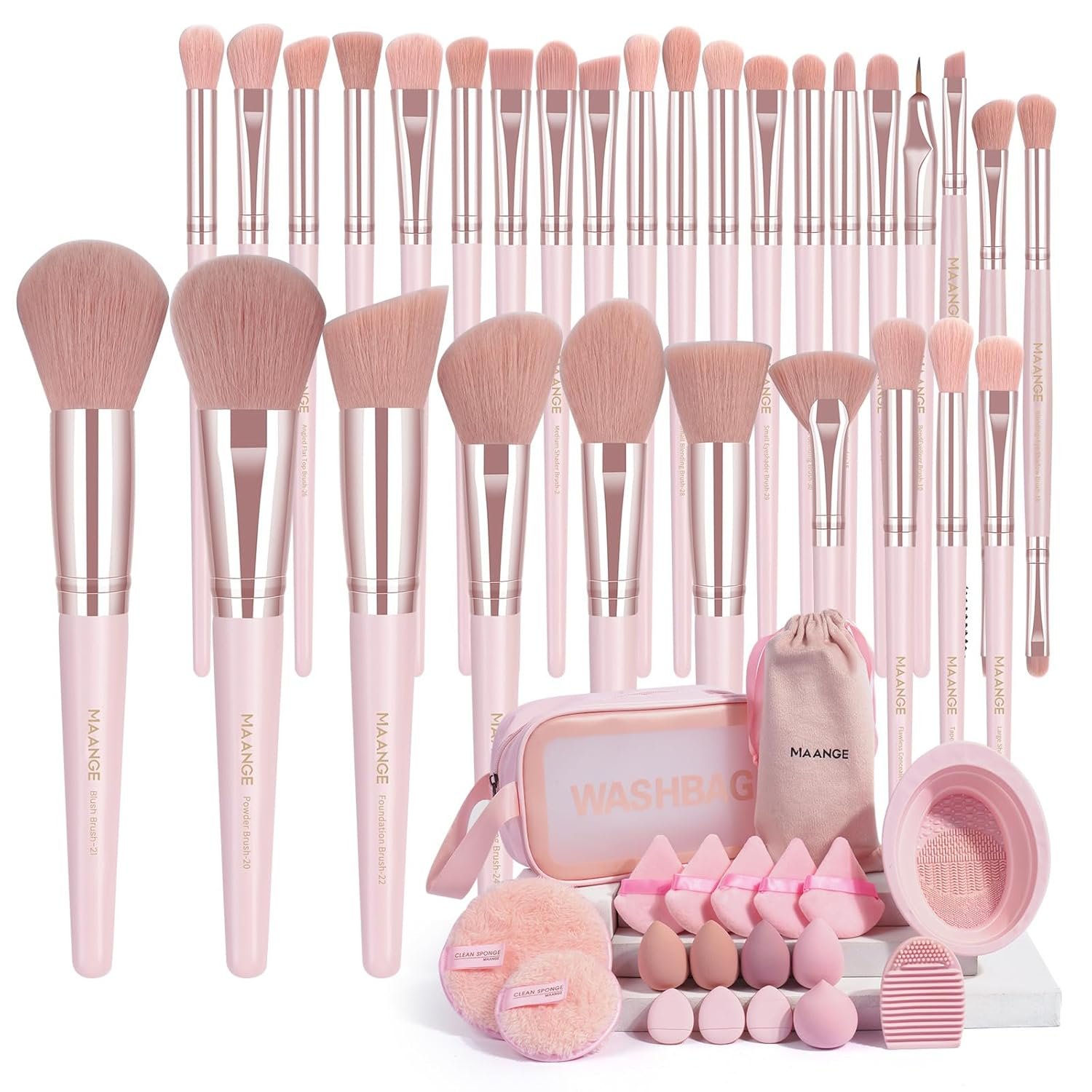 Package Included: 30pcs Professional Makeup Brush Set With 1 Velvet Bag,5pcs Beauty Blender,5pcs Triangle Powder Puff,3pcs Mini Thumb Puff,2pcs Big & Small Makeup Remover Puff,2pcs Cleaning Mat and 1Toiletry Bag.