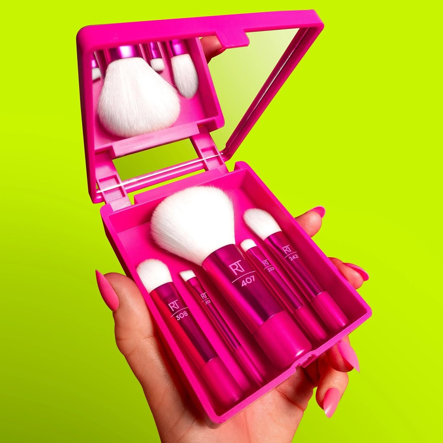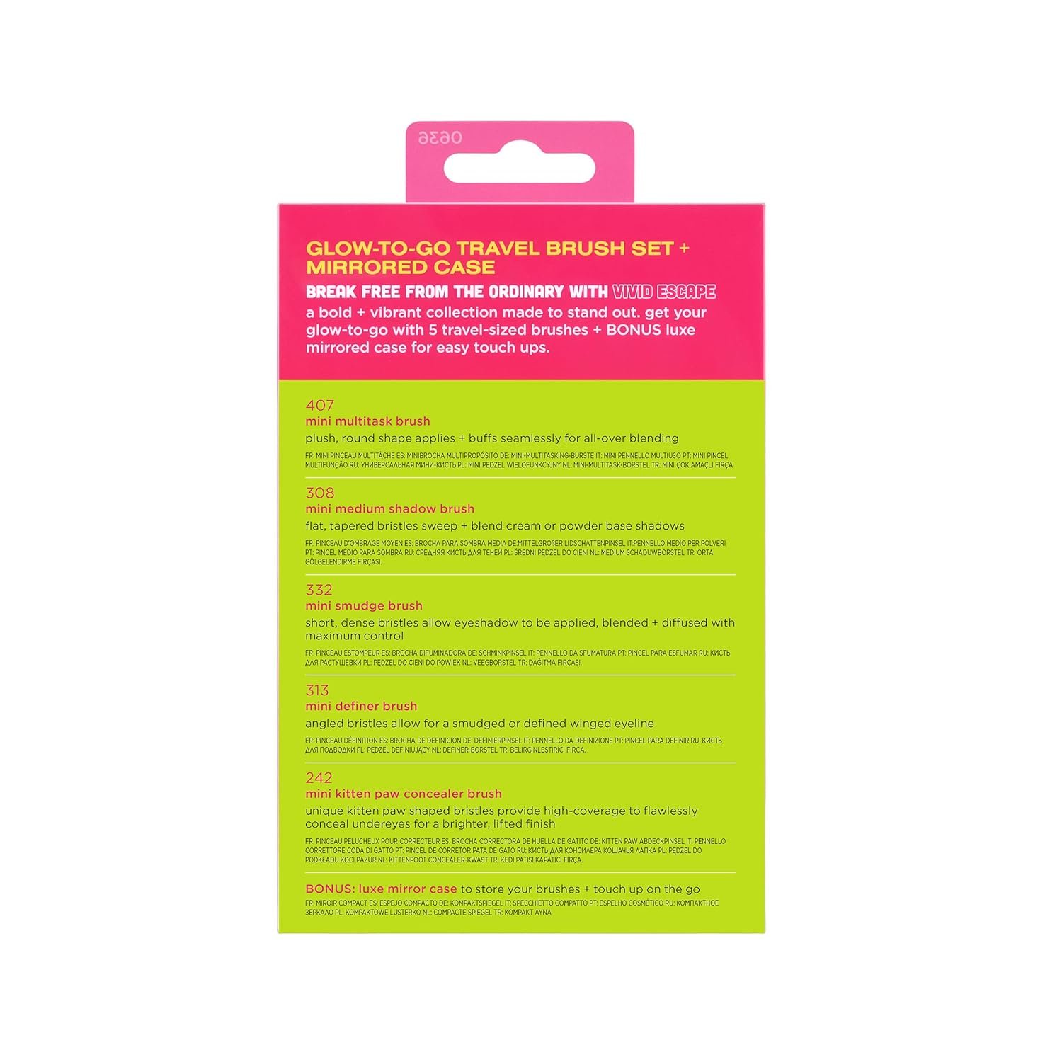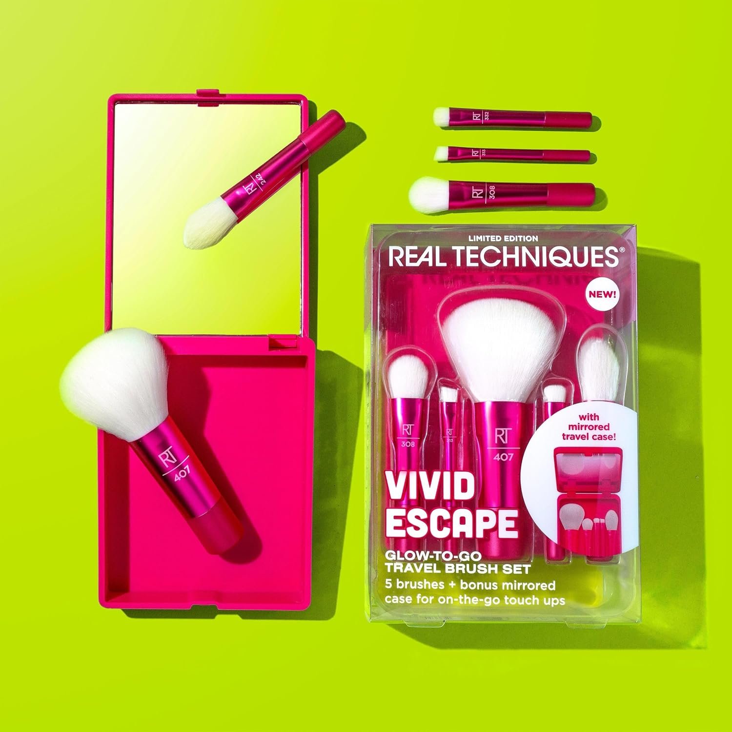 Break free from the ordinary with the Real Techniques Glow-To-Go Travel Brush Set featuring 5 mini makeup brushes to effortlessly blend, conceal, and shade for a natural, flawless base and a compact mirror for travel-friendly touch ups. This makeup brush set includes the 407 Mini Multitask Brush, 308 Mini Medium Shadow Brush, 332 Mini Smudge Brush, 313 Mini Definer Brush, 242 Mini Kitten Paw Concealer Brush, and Luxe Mirror Case. Each makeup brush works with liquid, cream, and powder products such as foundation, concealer, setting powder, highlighter, and more. Try all the products from our limited-edition Vivid Escape Collection – bold and vibrant tools made to stand out. Makeup brushes are easy to clean using our Real Techniques Brush + Sponge Cleansing Gel. They’re also 100% cruelty-free, vegan, and designed with UltraPlush, synthetic bristles. We are Real Techniques, the brand of choice for all makeup users, no matter your level of expertise. Created in collaboration with leading makeup artists, we aspire to take the mystery out of choosing beauty tools so you can focus more time on putting your best face forward one blend at a time. From full makeup looks, to quick beauty hacks, RT brushes + sponges are exceptionally high quality for professional looking results every time. BUT… don’t be fooled by our affordable prices, RT tools are award-winning + purposefully designed because that’s what you deserve. Quality without compromise.