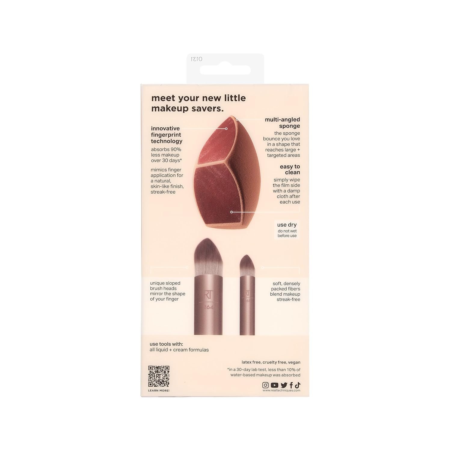 Meet your new little makeupsavers. The Real Techniques Makeupsaver Sponge + Brush Trio features the Makeupsaver Sponge and two makeup brushes that mirror the shape of your fingertip for precise application with a natural-looking finish. The makeup brush set includes the 267 Makeupsaver Base Brush, 265 Makeupsaver Concealer Brush, and the Makeupsaver Sponge. The Real Techniques Makeupsaver Sponge is lab tested to ABSORB 90% LESS MAKEUP*- because we get it. Foundation should always land on your skin, not in your tools. The Makeupsaver Sponge is designed with innovative makeup-saving technology to reduce makeup absorption while providing a natural, streak-free finish. The makeup sponge’s patented, multi-angled shape effortlessly reaches all areas of the face, both large and targeted, and it is best used dry. Both the of the makeup brushes feature unique sloped heads for seamless blending while their densely packed fibers ensure limited product is absorbed. The Makeupsaver brushes are easy to clean using the Real Techniques Brush + Sponge Cleansing Gel. Clean the Makeupsaver makeup blending sponge by simply wiping the film side with a damp cloth after each use. The makeup tools in this brush trio are all 100% vegan and cruelty-free and the brushes made with UltraPlush, synthetic bristles. *In a 30-day lab test, less than 10% of water-based makeup was absorbed. We are Real Techniques, the brand of choice for all makeup users, no matter your level of expertise. Created in collaboration with leading makeup artists, we aspire to take the mystery out of choosing beauty tools so you can focus more time on putting your best face forward one blend at a time. From full makeup looks, to quick beauty hacks, RT brushes + sponges are exceptionally high quality for professional looking results every time. BUT… don’t be fooled by our affordable prices, RT tools are award-winning + purposefully designed because that’s what you deserve. Quality without compromise.