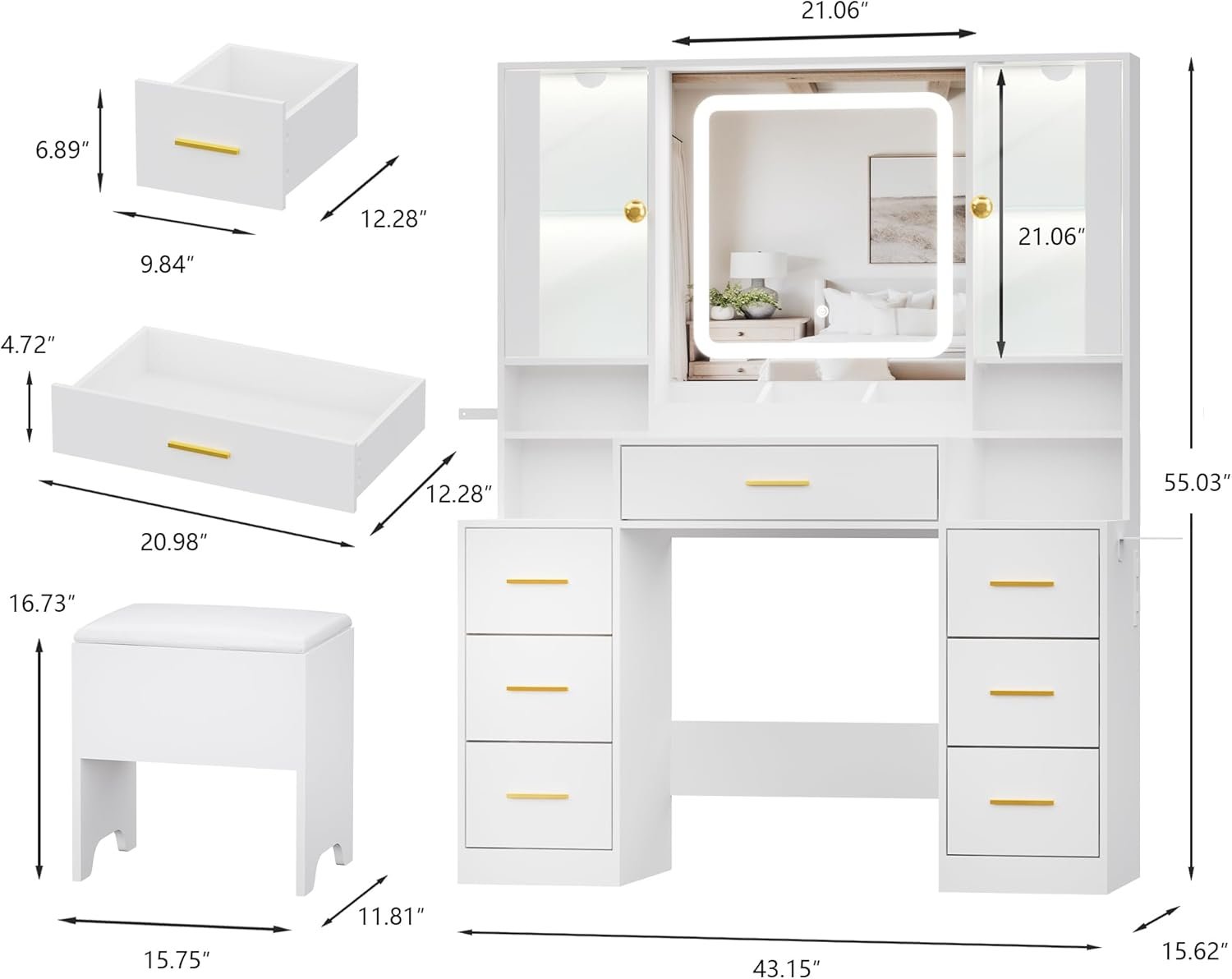 Ample Storage Space: Comes with seven drawers and two cabinets that provide generous storage options for your cosmetics, jewelry, and other beauty essentials. The vanity desk is designed to keep your items neatly organized, making it ideal for maintaining a clean and tidy makeup area.