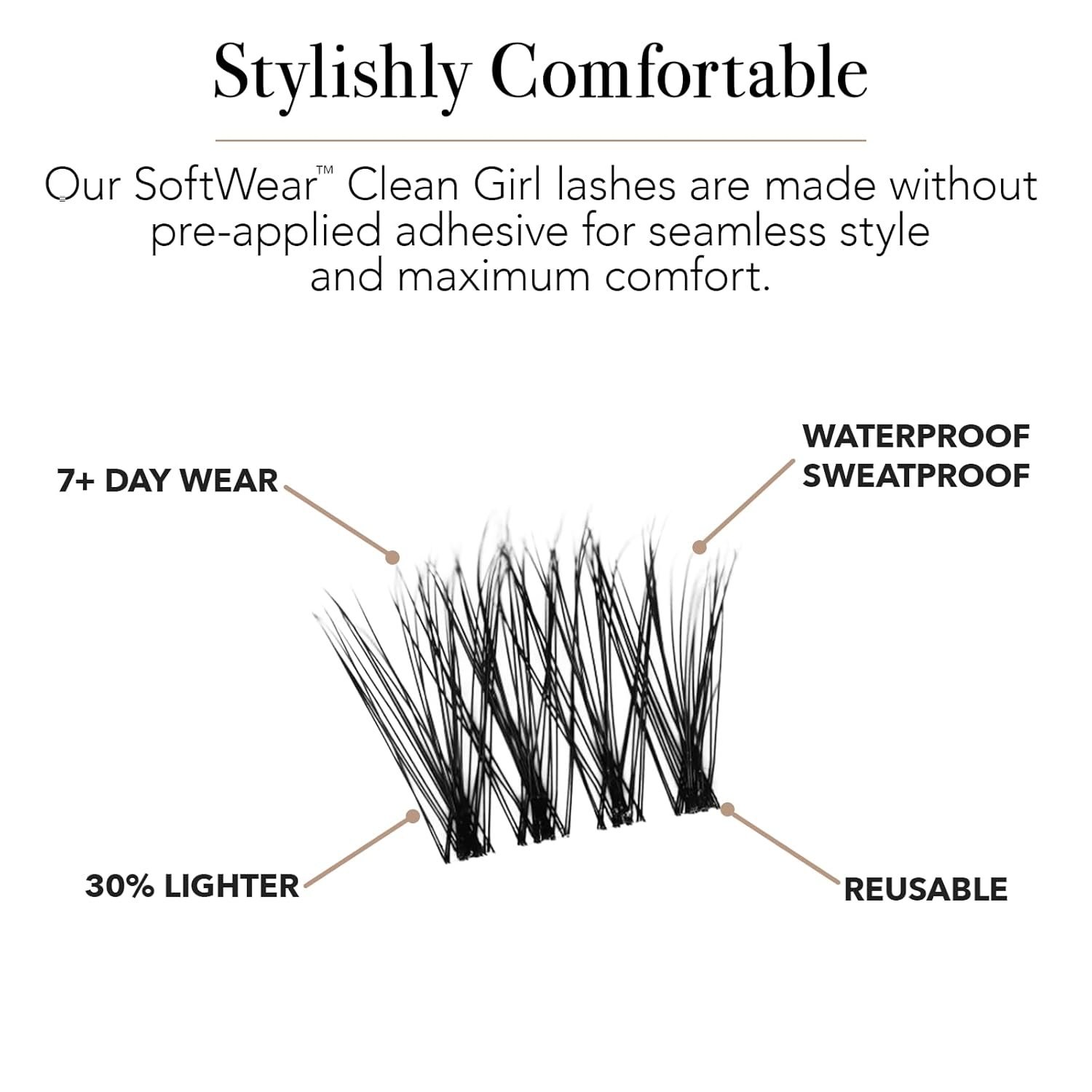7+ Days of Wear – Pro Lash SoftWear cluster eyelash extensions are built to last—up to 7 days of wear or more; sweatproof and waterproof, our adhesive system starts with our non-sticky Dual Lock Adhesive (included) that ensures a secure bond when crimped and locked into places with tweezers (included)