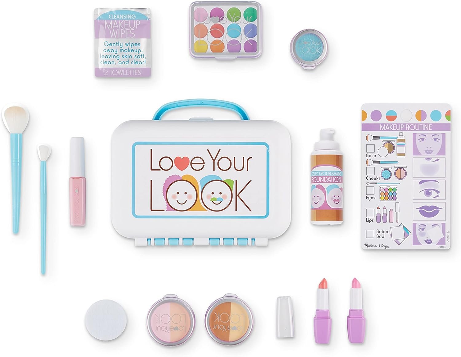 Kids can explore pretend beauty routines with the Melissa & Doug Love Your Look Pretend Makeup Kit, a 16-piece play set for mess-free fun. THIS SET DOES NOT CONTAIN REAL COSMETICS. Designed for preschoolers ages 3 and up, the set includes realistic accessories that look like real cosmetics but contain none—no color, no transfer, no mess. Kids can pretend to “apply” blush, powder, glitter, lipstick, and gloss, or experiment with the 12-color eye shadow palette and foundation pump bottle. Soft brushes, wipes in a resealable pouch, and a reusable activity card add to the fun. All pieces store neatly in the portable makeup case with a built-in mirror, making it easy to take play anywhere. Encouraging confidence, empathy, and creativity, Love Your Look helps kids build life skills through imaginative play—where every pretend makeover inspires self-expression and care routines made just for them. For more exciting pretend play, combine this set with the Melissa and Doug Wooden Beauty Salon Play Set, the Get Well Doctor Kit & the Examine and Treat Pet Vet Play Set, to build the ultimate pretend play world for hours of hands-on, screen-free play For 35+ years, Melissa and Doug has crafted imaginative preschool toys and durable wooden toys built to nurture childhood wonder, with everything from a life-sized grocery store playset to a play kitchen playset and play food to serve plush toys & puppets, to costumes, arts & crafts, and road trip activities for kids. It’s the kind of kid-powered play that builds independence and confidence