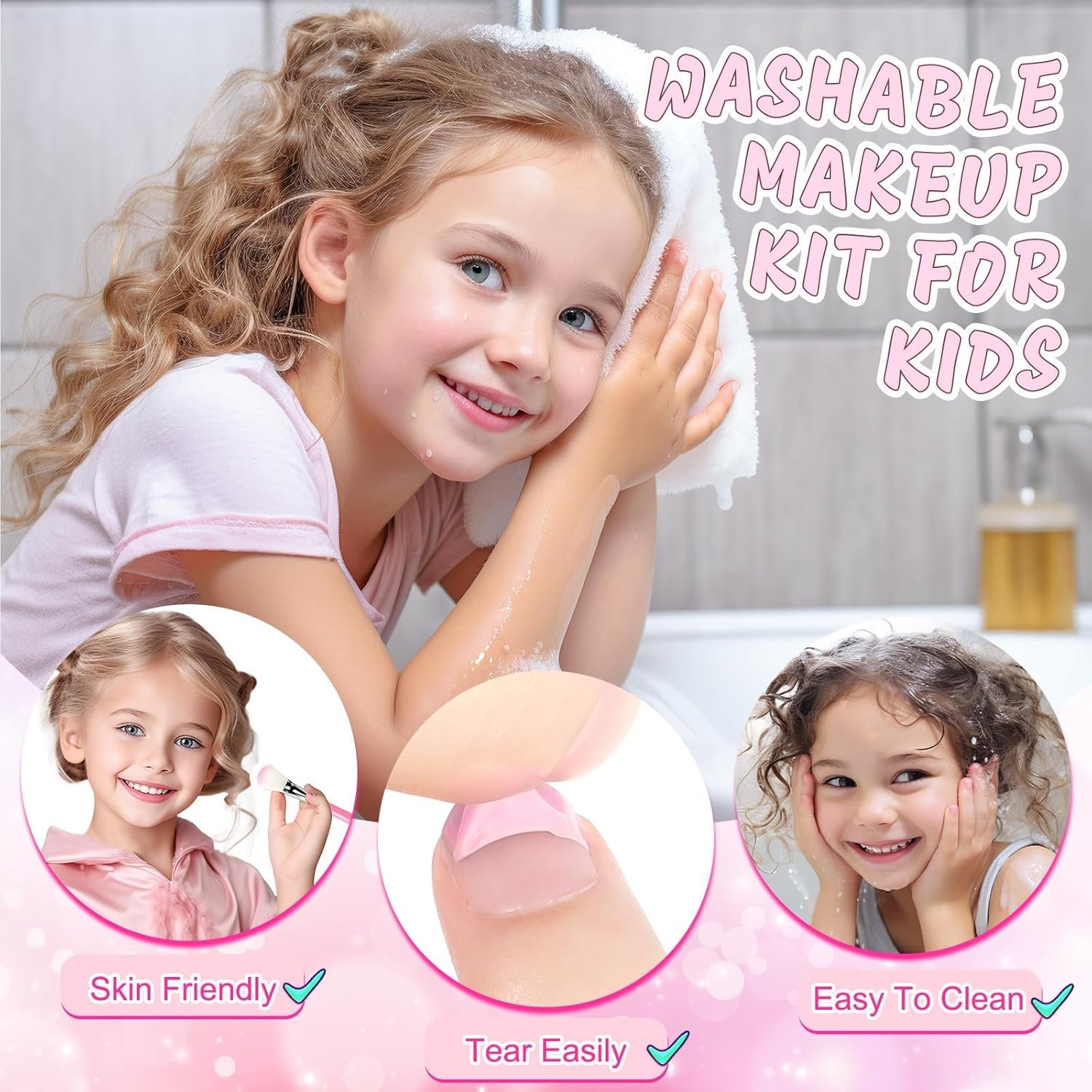 WASHABLE & NON-TOXIC: Make up kit for little toddler girls is made of safe, water-soluble materials that meets US toy safety standards(CPSIA, CPC, ASTM certificates).The toddler makeup kit is no preservatives, soft and compatible with the skin.Completely safe, washable, non-toxic, easy to clean, not irritating. Kids can use these washable make up set follow their heart.Great starter for little girls!