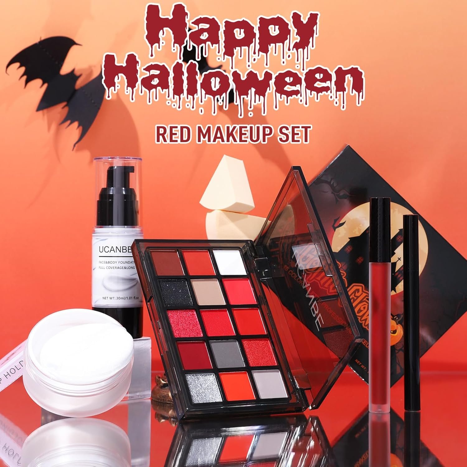 EYESHADOW PALETTE & FOUNDATION- This richly pigmented eyeshadow includes 15 shades in a haunting mix of blood red, deep burgundy, brick, black, white, silver, and glitter finishes. With a balance of matte, satin, shimmer, and pressed glitter textures for creating bold and intense looks .This full-coverage foundation designed to deliver a true white base, offers smooth, opaque coverage that works as a perfect blank canvas for any Halloween character makeup. Lightweight and blends evenly without streaking or cracking, provide costume-grade white skin effect.