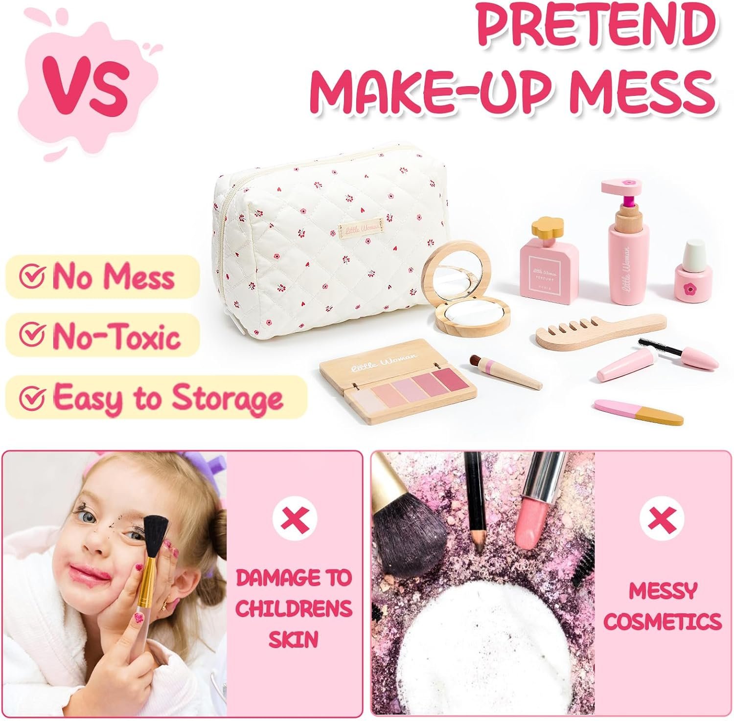 TIDY & CLEAN: Our wood makeup looks realistic, so girls can stay clean and neat while playing dress-up together! The warm texture of the wood not only won’t stain her clothes, but also won’t hurt her delicate skin, every touch is an intimate contact with nature, every play is a safe journey of exploration
