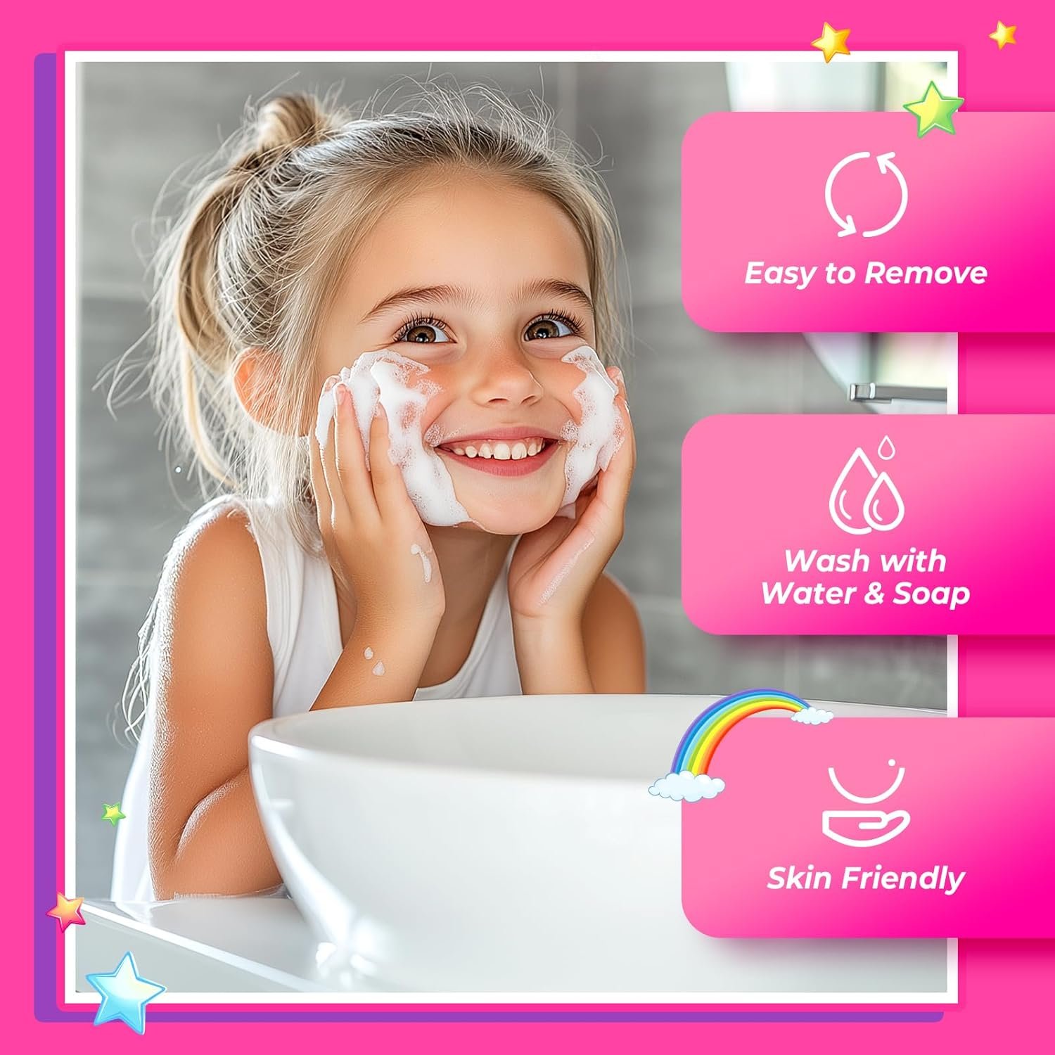 【Real Makeup & Washablec】Each color is perfect for kids for pretty made-up look. Easy to clean and washable with water (and light soap as needed), no need special makeup remover. No more fear of carpet-stain or furniture-marks, let her play all she wants!